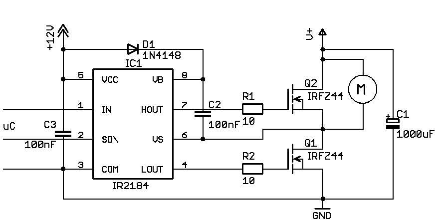 Ist der Halbbruecktreiber eigentlich fuer 12V Betrieb ueber der Last spezifiziert ? Die 1N4148 ist etwas schwach fuer den Vb von 12V her. Ich verwend dort eine 1A Schottky. Diese 12V sollten auch einen Cap haben, der groesser ist als die 100n des C11. Der Motor wird gegen GND angeschlossen, nicht gegen 12V. Und dann sollte man noch Schottkys parallel zu den Fets vorsehen. Die internen Dioden sind nicht genuegend. Fuer 12V wuerd ich nicht so einen Halbbrueckentreiber verwenden.