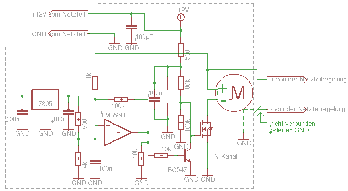 D.v. Barnefeld schrieb: > PS. Bitte entschuldigt mein Deutsch, ist nicht meine Muttersprache Ja, dein bayrisch ist kaum verständlich ... ;-) Du scheinst aber auch ein wirkliches Interesse an der Problemlösung zu haben und bist auch bereit etwas dafür zu tun. Ich habe dir einfach mal ein Beispiel aufgezeichnet wie es gehen könnte. Die Teile kosten in Summe etwas unter einen Euro, je nachdem wo du einkaufst. Eine Lochrasterplatine kostet noch mal 1,50 Euro. (Man könnte das auch als SMD-Version machen, sogar mit richtiger Platine und passendem Stecker für den Lüfter.) Man müsste aber genau wissen an welcher Stelle die interne Regelung den Strom begrenzt, entweder bei +12V oder bei GND. Meist ist es so dass die Regelung des Netzteils zwischen dem negativen Anschluss von Lüfter und GND vom Netzteil liegt. Wenn es bei deinem Netzteil so sein sollte dass die Regelung zwischen +12V und dem positiven Anschluss deines Lüfters sitzt müsste ich die Schaltung etwas ändern.