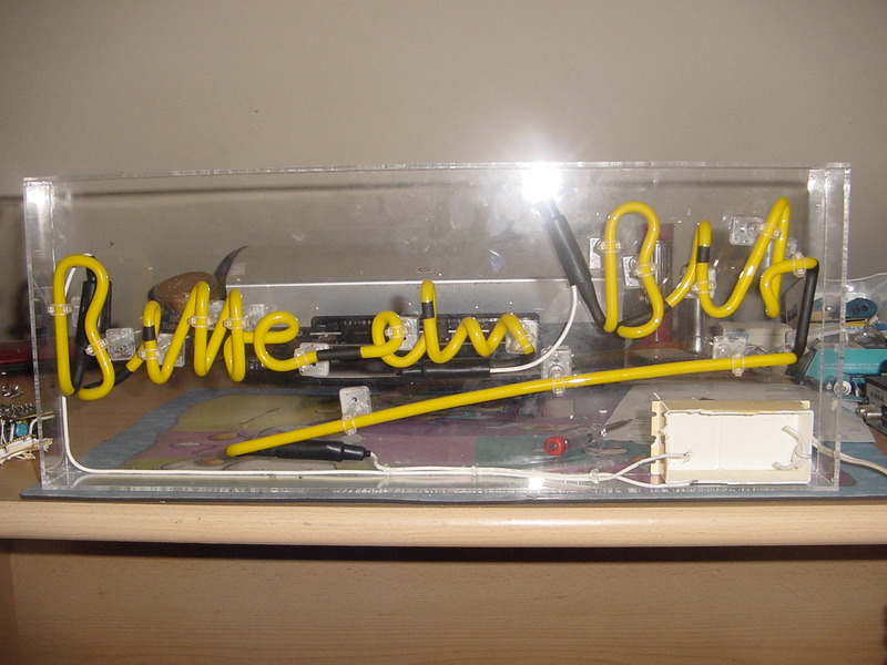 MaWin (Gast) hat ganz Recht. Es handelt sich um eine Gasentladungsröhre. Um sich einen größeren Aufwand zu sparen würde ich ein Fertigteil wie dieses: http://www.ebay.de/itm/leuchtreklame-neon-/261616330621?pt=Neon_Leuchtreklame&hash=item3ce98c677d verwenden. Brauchst nur die dort eingebaute Röhre entfernen und das übriggebliebene Vorschaltgerät an deine "Bitte ein Bit" Anordnung zu klemmen. Diese Lösung wäre günstig, schnell und sauber. LG