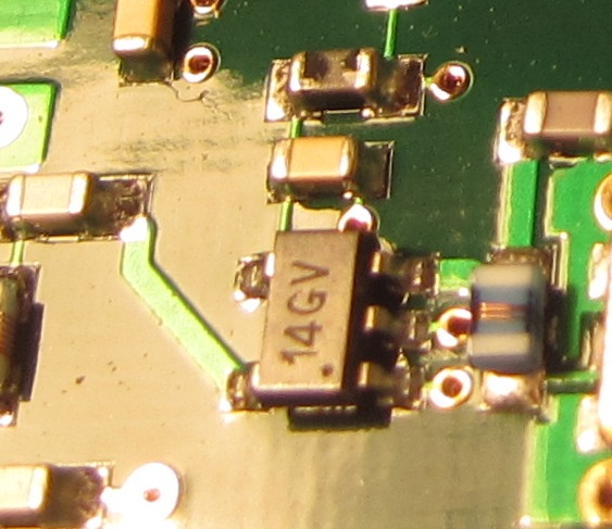 Haben wir eine Chance, den Hersteller einzugrenzen? Sind noch andere MMICs, mit Herstellerlogo, auf dem Board? Ist das SOT23-5 oder SC70? Passt der http://datasheets.maximintegrated.com/en/ds/MAX2630-MAX2633.pdf auf den Print, sprich ist das ein Standardpinning?