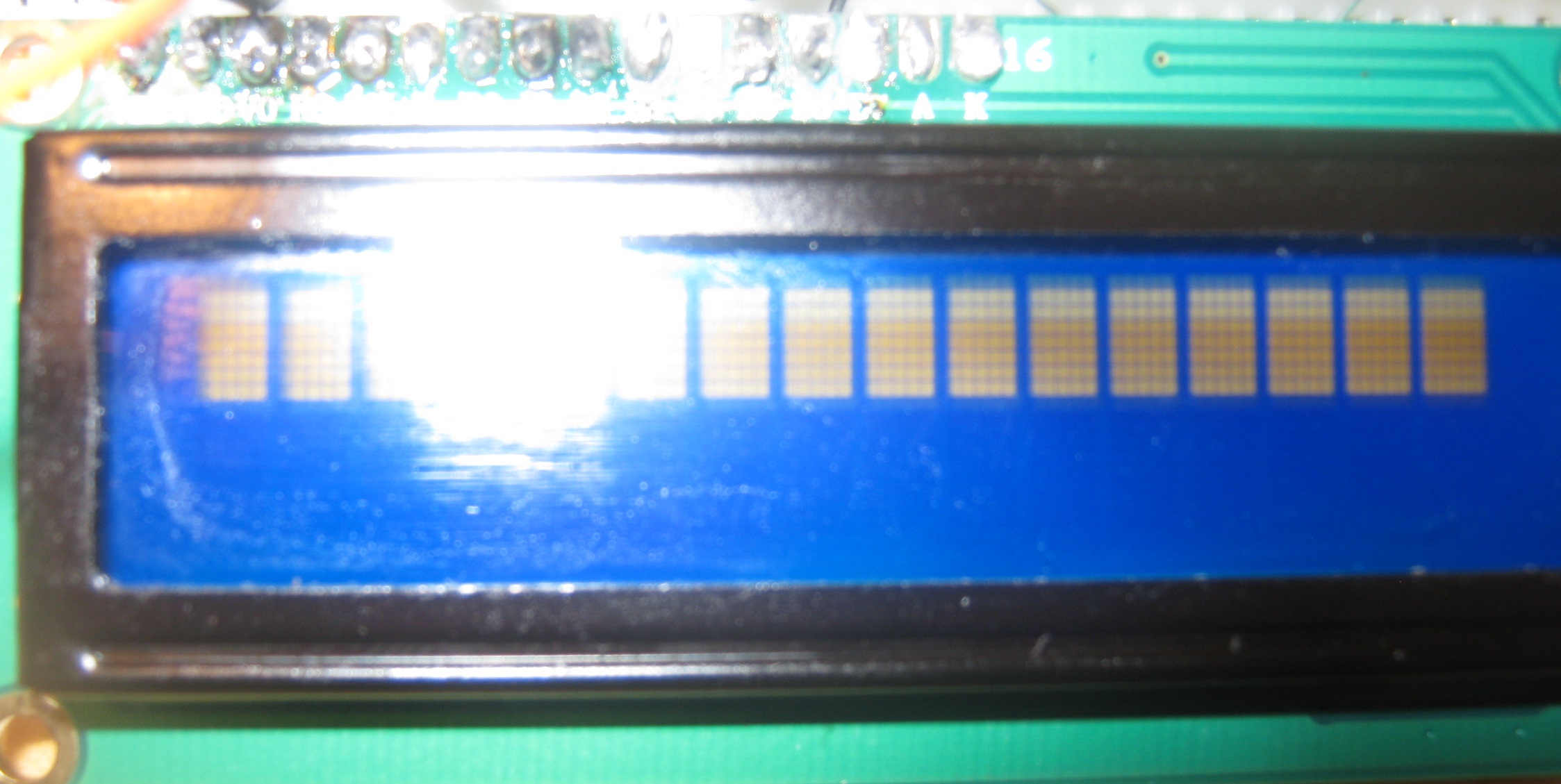 Das sieht aus wie ein weißes Display mit blauer Hintergrundbeleuchtung. Ich habe mal ein defektes Display dieses Typs gesehen - da hatten sich die Pixel tatsächlich teils leicht gelb verfärbt. Dabei hat der Controller aber auch Schaden genommen. Am besten schmeißt du das Ding weg und benutzt ein neues, sonst spielen dir eventuell jetzt noch unsichtbare Fehler einen Streich.