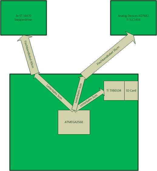 Hallo Forumsgemeinde ;) Ich habe ein Kommunikationsproblem mit einer SPI Leitung. Vorweg mal ein paar Specs: ATMEGA 2560 SPI-Freq: 1MHz, SCK MOSI RC-TP 33R/22pF Empfänger AD7682 MOSI Leitungen 33R Serienwiderstand. und bei den L6470 15R 22pF 15R T-Filter. Die Leiterplatten sind selbst mit der Handbestückt und mittels einen kleinen Reflow Ofen gelötet. Wobei hier immer wieder Kurzschlüse am ATMEGA nach dem Löten vorkommen die ich per Hand mittels Litze entferne. Die 2 Externen Prints sind mittels Flachbandkabel miteinader verbunden. Zwischen den Leitungen ist immer eine GND Leitung geführt. Jetzt habe ich das Problem sobald ich die Print mit dem L6470 anschließe funktioniert die SD Card nicht mehr bzw sie kann nicht mehr gelesen werden. Wird der Print abgesteckt ist dies wieder möglich. Entferne ich den Serienwiderstand an der MISO Leitung am TXB0104 so ist es manchmal möglich die SD Card zu lesen jedoch mnchmal nicht. Die Versorgungsspannung der Prints ist 12V und jeder Print erzeugt sich selbst eseine benötigten 3V3 od. 5V die wiederum mit einem Ferrit und 10u 100n 10n gepuffert sind. Ich habe den Wellenwiderstand mit einem LC Meter versucht herauszufeinden der Flachbandkabel und ich komme auf Z=sqrt(L/C)=sqrt(0,4uH/18pF)=182 Ohm. Hättet Ihr eventuell eine Idee zu dem Problem? Wird noch genauere Information benötigt? Ringing ist meiner Meinung nicht störend vorhanden.