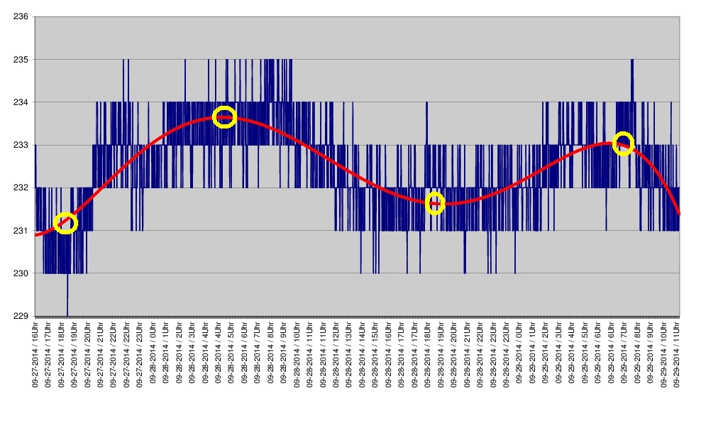 Geschätztes Forum, mit einem Beschleunigungssensor BMA020 von BOSCH zeichnete ich tagelang die Erdanziehungskraft auf (Raumtemperatur nahezu konstant). Messort: Erfurt / Thüringen Das Resultat findet Ihr in im xls-File, der Messwert der Y-Achse schwankte in dieser Zeit um. ca. 1 Digit (Sensor stand hochkant) Die Trendlinie verglich ich mit der Mondposition (Stellarium). Immer dann, wenn der Mond die Südhalbkugel der Erde anschaute, erhöhte sich die Erdanziehungskraft. Vielleicht besitzt jemand von Euch genauere Messdaten, würde gern wissen, wie stark sich das Gewicht eines Körpers durch den Einfluss des Mondes auf der Erde ändert? Gibt es genauere Sensoren, den die 10 Bit vom BMA020 reichen für manche Anwendungsfälle nicht aus? Ab jetzt empfehle ich meiner besseren Hälfte, sich nur dann auf die Waage zu stellen, wenn sie von ihrer momentanen Erd-Position aus den Mond sehen könnte ;-) Bernhard