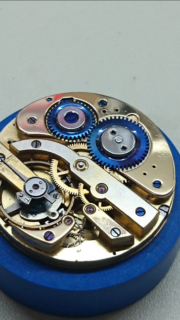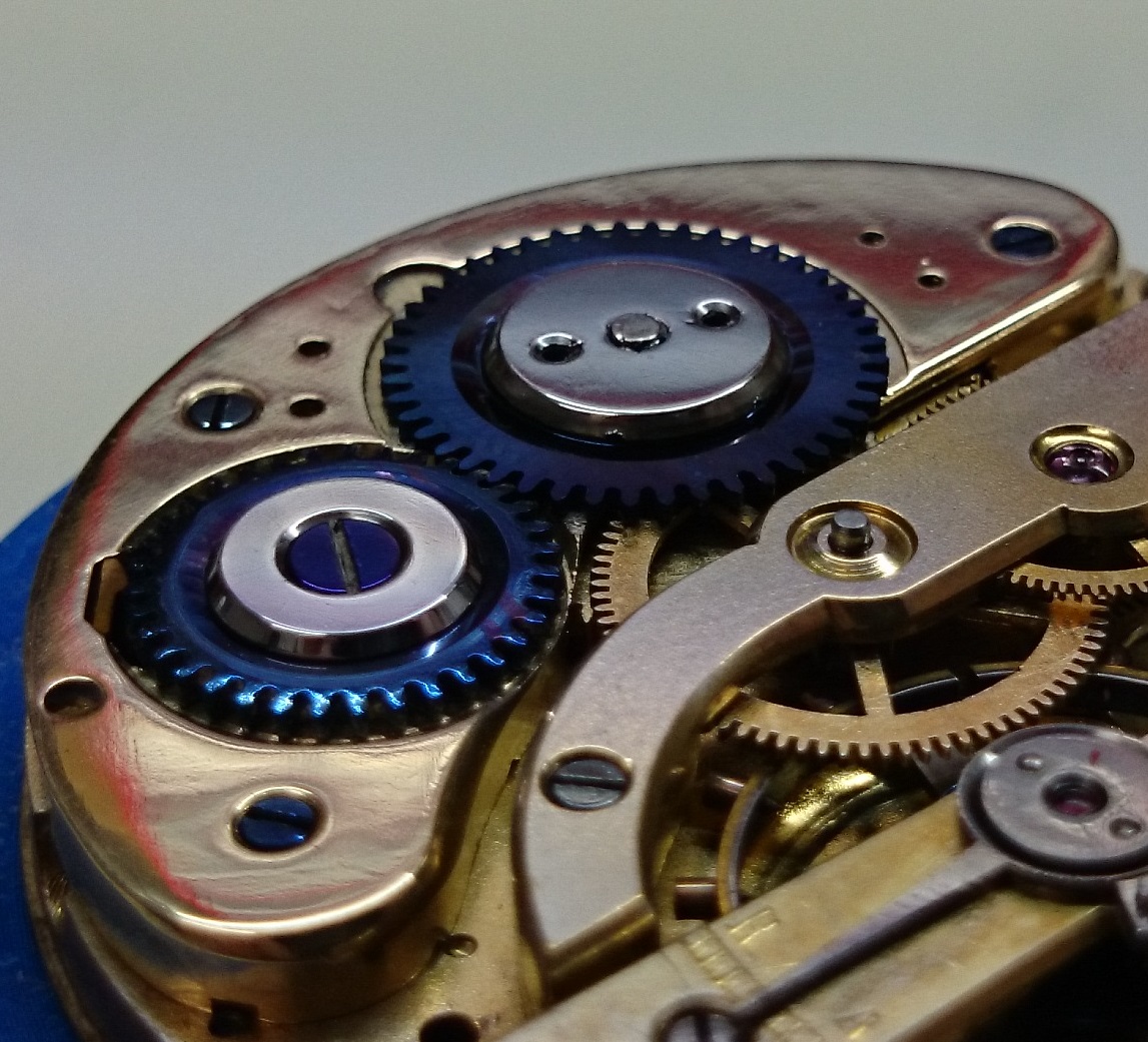 Hier mal kurz das bisherige Ergebnis vom Nass Schleifen und Polieren mit Baumwolle (Das Uhrwerk ist übrigends ein kaputtes von Ebay zum Üben, dort fehlen ein paar Lagersteine und ein paar Zahnräder haben ein paar Zähne zu wenig). Man sieht besonders oben rechts, dass das Metallteil "Dellen" hat. Auch die große Mutter in der Mitte ist nicht makellos. Ich würde das Metallteil gerne so bearbeiten wollen, dass es wie ein Spiegel wirkt.