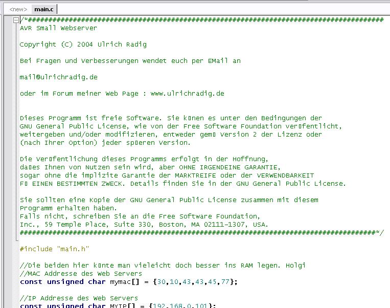 Du hast da drei wirre zeichen drin: 00000000 EF BB BF 2F 2A 23 23 23 23 23 23 23 23 23 23 23 23 23 23 23 23 23 23 23 .../*################### 00000018 23 23 23 23 23 23 23 23 23 23 23 23 23 23 23 23 23 23 23 23 23 23 23 23 ######################## 00000030 23 23 23 23 23 23 23 23 23 23 23 23 23 23 23 23 23 23 23 23 23 23 23 23 ######################## 00000048 23 23 23 23 23 23 23 23 23 23 23 23 23 23 23 23 23 23 23 23 0D 0A 41 56 ####################..AV 00000060 52 20 53 6D 61 6C 6C 20 57 65 62 73 65 72 76 65 72 20 0D 0A 0D 0A 43 6F R Small Webserver ....Co 00000078 70 79 72 69 67 68 74 20 28 43 29 20 32 30 30 34 20 55 6C 72 69 63 68 20 pyright (C) 2004 Ulrich Dein Editor zeigt sie evtl nicht an :-X