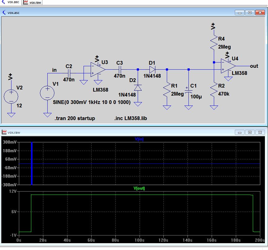 Hallo, die gezeigte Schaltung ist fehlerhaft. http://www.foxdelta.com/products/sound/sc2/sc2-vox.jpg Zumindest fehlt ein Widerstand zwischen Pin5 des LM358N und Plus (Pin8). ich würde da mal 2 bis 10 MegOhm einsetzen. VG Fred