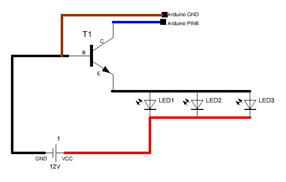 In dem Schaltbid bibt es mehrere absolute Pfuis. 1. LEDs dürfen nicht direkt parallel geschaltet werden. 2. An den LEDs liegt die Spannung gerade falsch gepolt an. Bei 12V würde das die Diode sofort zerstören. 3.LEDs brauchen eine Strombegrenzung, z.B. durch einen Widerstand. 3. Die Masseverbindungen sind völlig wirr. (schwarz an Masse? direkt an Basis des Transistors?) 4. Auch die Ansteuerung des Transistors (am Kollektor?)ist so nicht möglich. 5. An der Basis, dem Steuereingang des Transistors ist ein Widerstand notwendig, sonst wird der Ausgang des Arduino überlastet. usw. Schau Dir mal im Tutorium an, wie Verbaucher wie LEDs,Relais usw. von einem Kontroller her angesteuert werden.