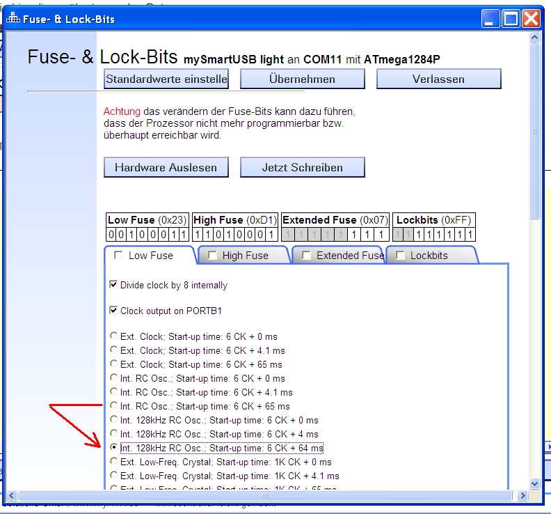 >Ja, du musst den ISP Takt jetzt auf kleiner 128kHz/4 drehen. >Also kleiner als 32kHz. Danke für den Tipp ! Kann man irgendwie bei o.g Programmer, mySmartUSB, den ISP-Takt ändern?