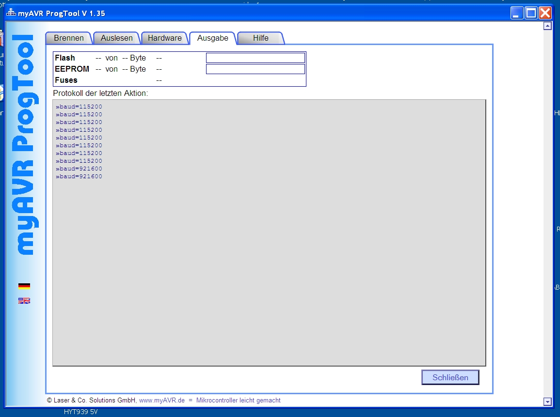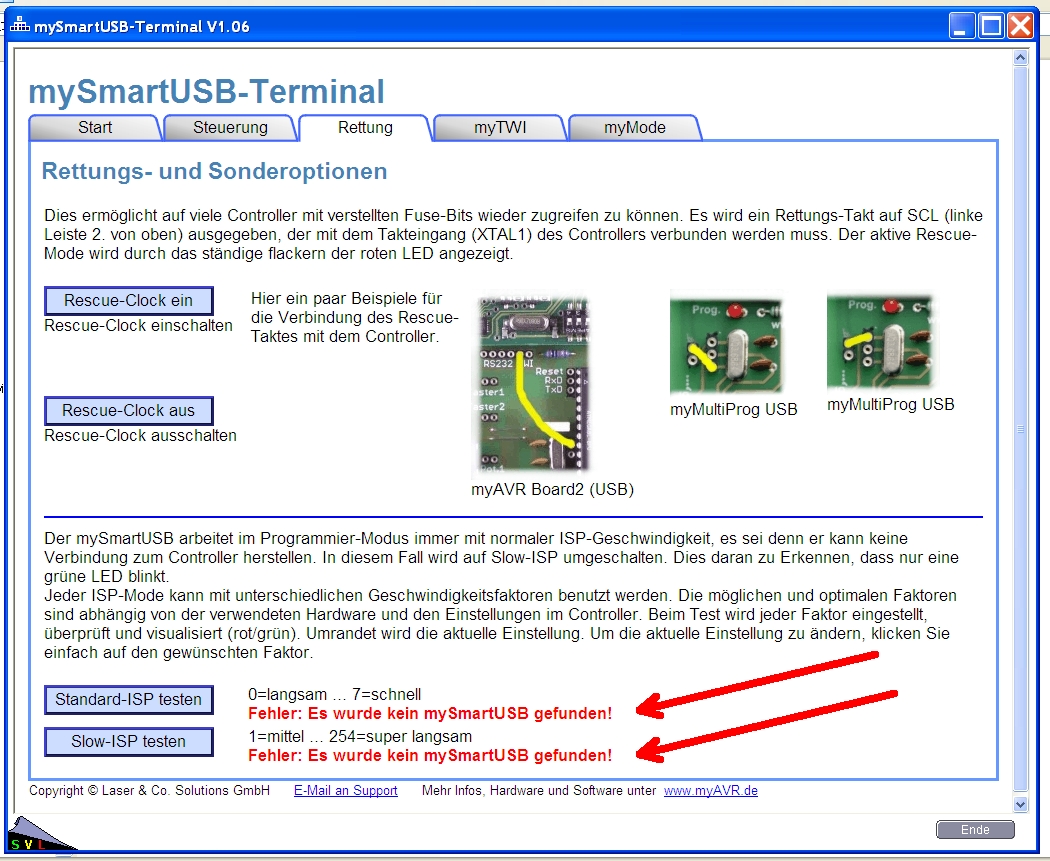 >Für den mysmartusblight gibt es auf myavr.de ein kommandowerkzeug in dem >man den takt runtersetzen kann Ich finde dieses werkzeug nicht :-( >Bitte schreib uns, obs klappt... Danke für den Hinweis. Leider klappt es noch nicht :-( Es kommen nur Fehlermeldungen (s. "5.jpg") Vermutlich wird mein "mysmartusb light" nicht korrekt erkannt, kann sein, daß das Programm für ein anderen Programmer "mySmartUSB MK2"gedacht ist.