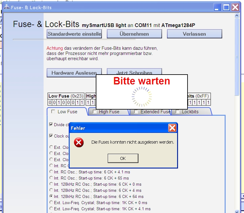 Geschätzes Forum, mein ATmega1284 lässt sich plötzlich nicht mehr ansprechen, auslesen und programmieren :-( Was ist passiert? Ich spielte mit den FUSES und lies mir den Takt an PB1 ausgeben. Zuerst 1MHz, dann 8MHz, ich war begeistert. Dann setzte ich die FUSES von "Int RC OSC" auf "int 128kHz". An PB1 liegt seitdem eine Frequenz von 14,920kHz an, d.h sein interner Takt ist 128kHz/8. Aber der ATmega1284p lässt sich nun nicht mehr ansprechen. - ich verwende den Progarmmieradapter mySmartUSB - die RESET-Leitung wird bei Verbindungsaufbau gegen GND gezogen, eine LED zeigt den Zustand an. - ein PC Neustart half auch nicht - aktuellstes Progammiertool-Update.... ohne Erfolg - anlegen eines externen 1MHz Taktes an verschiedene PINS des µC brachen nichts - Der Einbau eines 1µF ELKO zwischen der RESET-Leitung und GND... ohne Erfolg Was habe ich falsch gemacht? Könnte es vielleicht sein, das die SPI-Übertragung des Programmers eine zu hohen Takt hat, womit der µC nicht zurecht kommt? Danke Bernhard