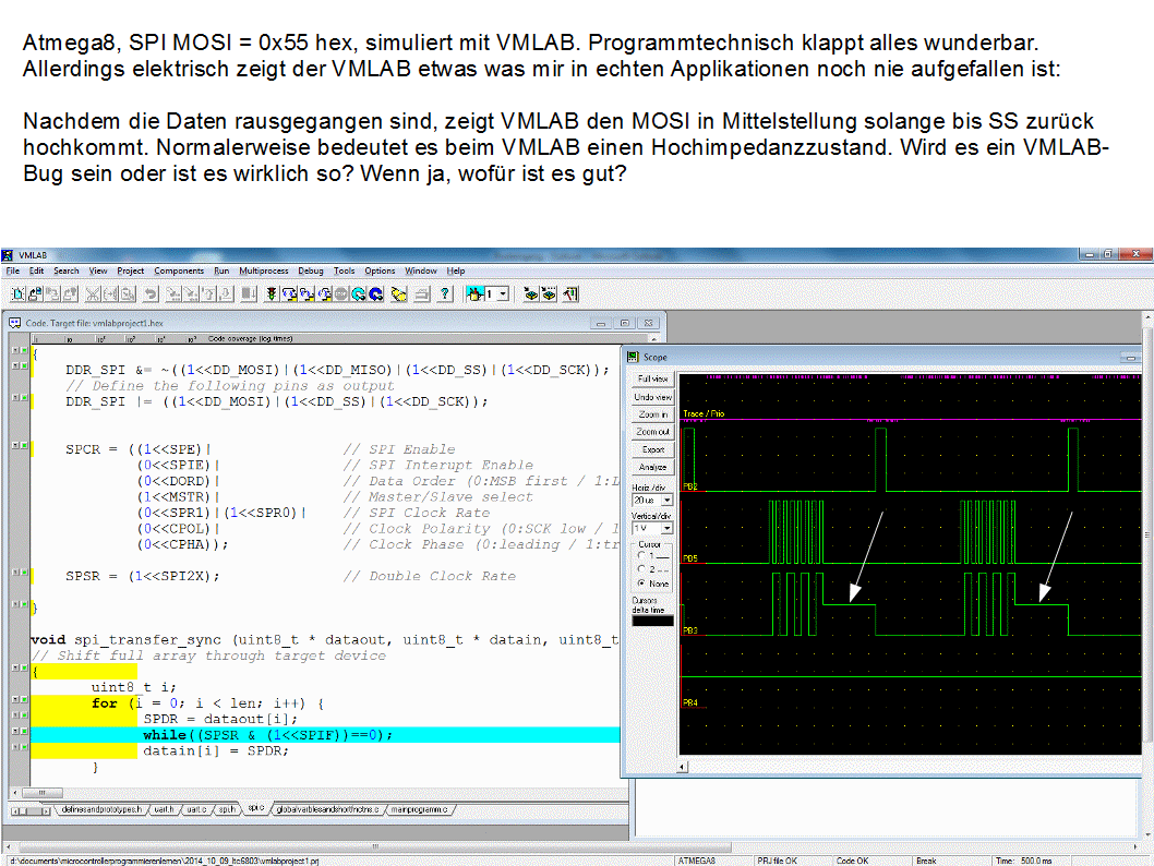 @ Michal Polanski (michal) >es funktioniert alles wie es soll, das ist nicht das Problem. >Allerdings habe ich beim Hardware-SPI ein elektrisches Verhalten >beobachtet - Anhang - welches ich einfach verstehen möchte. FALSCH! Du betrachtest eine SIMULATION! Das ist ein Bug oder Feature im Simulator. Die echte Hardware gibt immer den Wert des letzen Bits aus, MOSI geht nie auf Tristate.