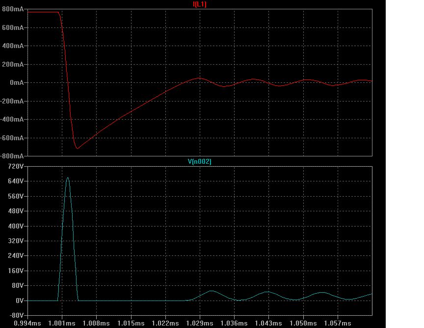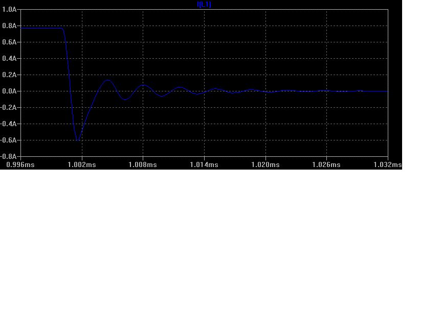 Possetitjel schrieb: > Michael W. schrieb: > >> Woher kommt der Effekt, dass der Strom im Ausschaltzeitpunkt >> negativ wird? Ich habe die Freilaufdiode absichtlich >> weggelassen (!) , da ich wissen will, woher das kommt. Ist >> das ein kapazitiver Effekt? Der Strom wird erst negativ und >> geht erst dann gegen Null. > > Ich bin verblüfft. > > Du hast einen Serienschwingkreis in der Schaltung und wunderst > Dich, dass der Kreis nach einer Anregung mit einem Sprung > schwingt? Man erkennt doch deutlich die gedämpfte Schwingung. OK-ich habe die falsche Schaltung gepostet. Das C habe ich erst im Nachhinein dazu gegeben. Jetzt mit richtiger Schaltung. Der Strom fließt nach dem öffnen des MOSFETs weiterhin in diesen hinein. Ich möchte wissen, was das genau ist, und wie man es korrekt modelliert. Das Bild zeigt, dass hier noch ein anderer Effekt mitspielen muss. Es ist ja keine reine abklingende Schwingung, sondern man sieht bei -700mA eine starke Änderung, ab der es wieder hinauf geht.