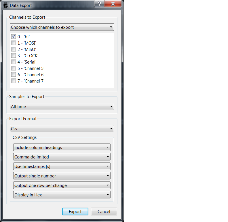 Hallo, ich verwende einen Salea Logic Analyzer um eine UART auszuwerten. Im Programm wird das Signal auch schön per HEX oder ASCII dargestellt. Möchte ich nun einen Datenexport machen, wird in der *.CSV die Zeit und das Jeweilige Bit zu der Zeit angezeigt. Ich möchte jedoch das ich die HEX Werte in meiner *.CSV habe. Ja, ich habe auch HEX gewählt :)