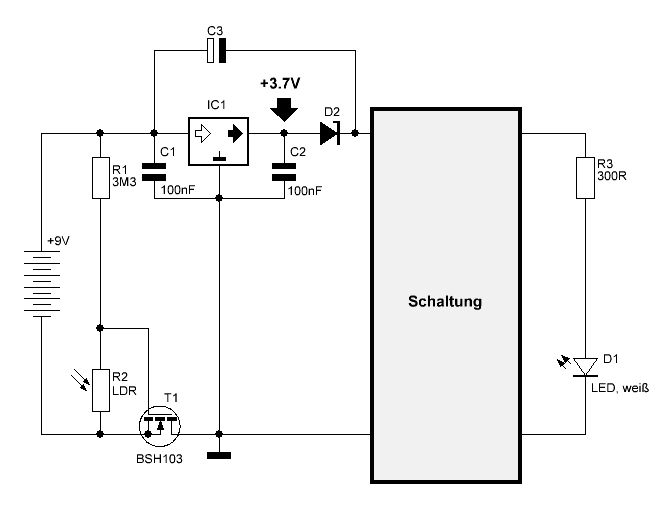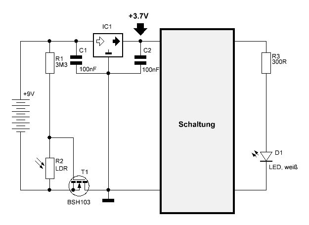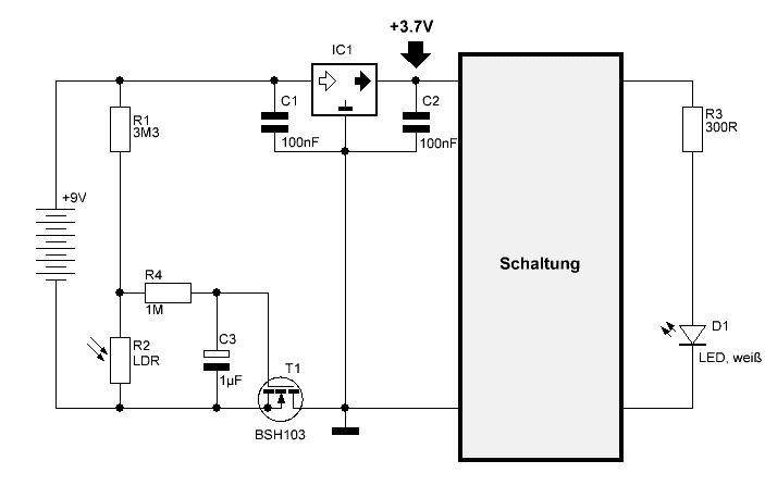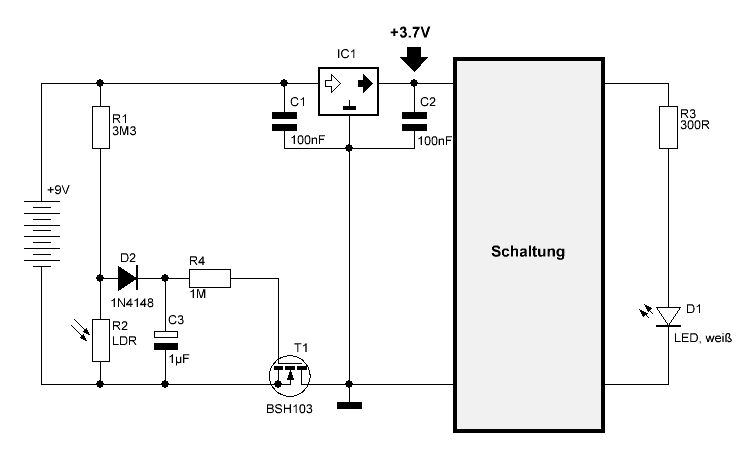 Das stimmt leider nicht. Wenn der LDR beleuchtet wird, wird er sehr niederohmig und entlädt damit den Kondensator sehr schnell. Hat also praktisch kleine Wirkung. Zu groß kann ich den Kondensator auch nicht wählen, weil er 1. über 3M3 geladen werden muss und 2. aus platzgründen kein großer Elko unterzubringen ist. Ich habe es inzwischen so (siehe Bild) versucht: Dies bewirkt sowohl eine Ein- als auch Ausschaltverzögerung. Währe ja wie gesagt kein Problem. Wird aber nun der LDR beleuchtet, wird der FET immer schlechter leitend, was zur Folge hat, dass IC1 immer weniger Masse bekommt. Die Ausgangsspannung von IC1 steigt dabei langsam bis auf die 9V Batteriespannung an. Dies ist natürlich nicht gewünscht. Die 3,7V sollen blos für ein paar Sekunden bestehen bleiben um die Schaltung weiter zu versorgen. Irgendwie beißt sich hier die Katze in den Schwanz :-| lg, Jonny