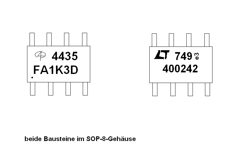Hallo, ich suche die Datenblätter zu den beiden ICs im Anhang (möglichst die vom Hersteller). Der IC links dürfte ein MOSFET sein. Der rechte ist wohl von Linear Technologie produziert. Wirklich konkretes konnte ich bisher weder bei Google, noch bei AllDataSheets etc. finden. Die Skizze ist mit Paint angefertigt, hoffe, man kann es erkennen. Viele Grüße!