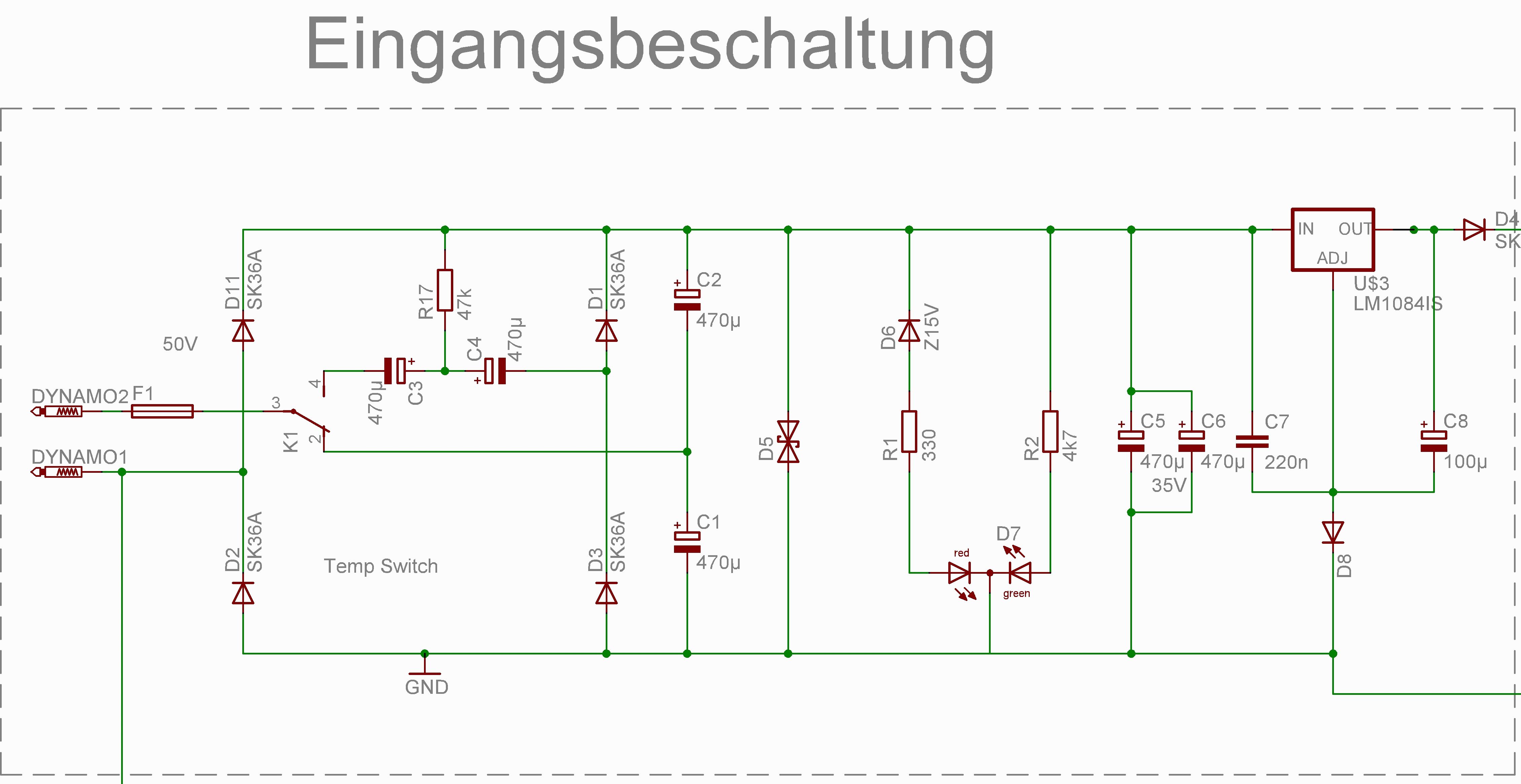Robert schrieb: > @Matthias L, wo finde ich denn "Forumslader reloaded"? Im Prinzip per Google, damit landest du in den passenden Threads in verschiedenen Fahrrad-Foren oder bei Hagemann Bikeparts, weil Patrick Hagemann das Ding ausgeknobelt hat. Leider scheint er den lange Zeit frei verfügbar gewesenen Schaltplan offline genommen zu haben. Die Eingangsschaltung (nur um die geht's ja hier) sieht ungefähr so aus wie im Anhang. Ich hab' Quick & Dirty die Sicherung weggelassen und an ihrer Stelle den Temperaturschalter PepiC von Pollin eingesetzt, der thermisch gut mit D5 gekoppelt ist, einer 22V-Suppressordiode. Der Schalter K1 schaltet zwischen Spannungsverdoppler- und Brückengleichrichter-Modus um. Dazu passt diese Lektüre: http://www.pilom.com/BicycleElectronics/DynamoCircuits.htm#DualMode D7 ist die Betriebsanzeige, die Leuchtet, sobald der Dynamo irgendwas von sich gibt, D6 leuchtet hingegen, wenn der Akku fast voll ist, kaum noch Strom aufnimmt und daher die Spannung vor dem Regler hochgeht. Regler und Akku habe ich wie schon geschrieben anders gelöst als beim Forumslader üblich und die Umschaltung habe ich wie im o.a. Link vorgestellt vollelektronisch gemacht. Letzteres ist aber im Nachhinein betrachtet Spielerei.