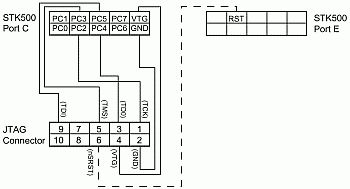 Es gibt für den STK500 ein Adapter wo du auf den JTAG Schnittstelle direkt zugreifen kann, ob man so wie du es macht auch geht weiss ich nicht, theoretisch sollte gehen nun das mit dem Reset Pin sollte man prüfen, Atmega32 hat kein E-PORT