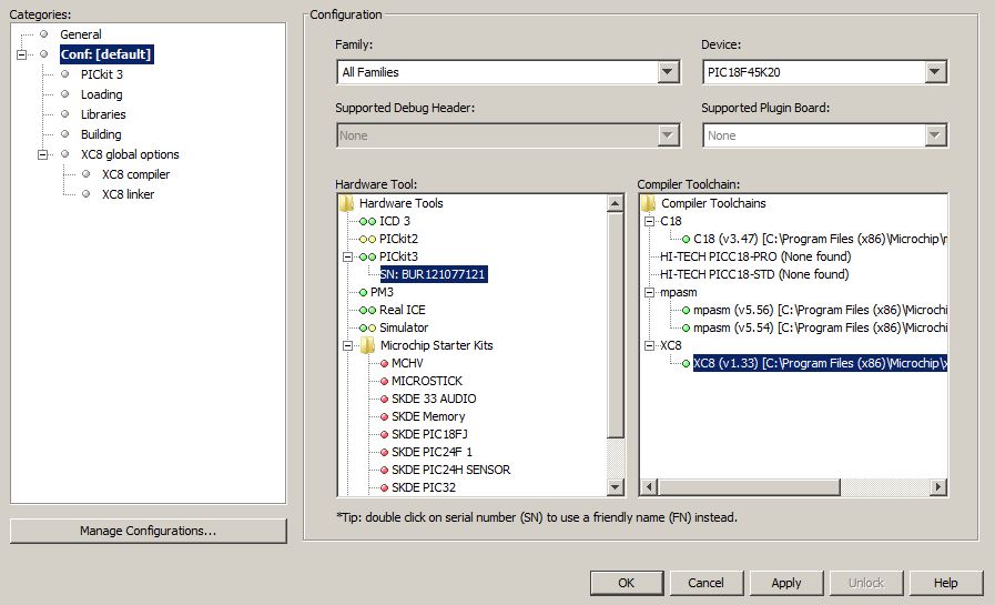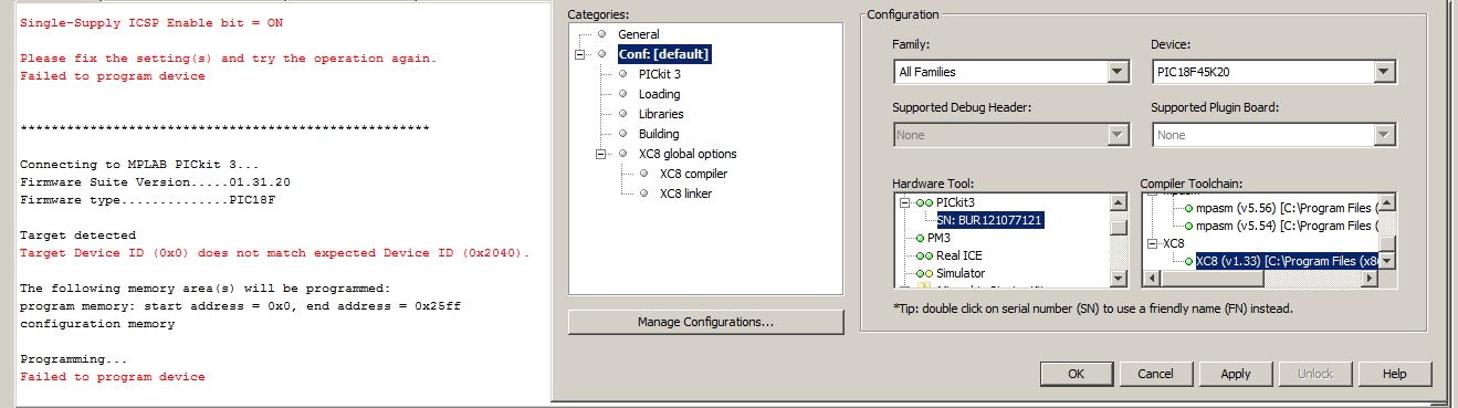 Starte alles noch mal neu, incl. Rechner ausschalten. Schaue auch auf die Bezeichnung Deines PICs, ob da wirklich PIC18F45K20 drauf steht.