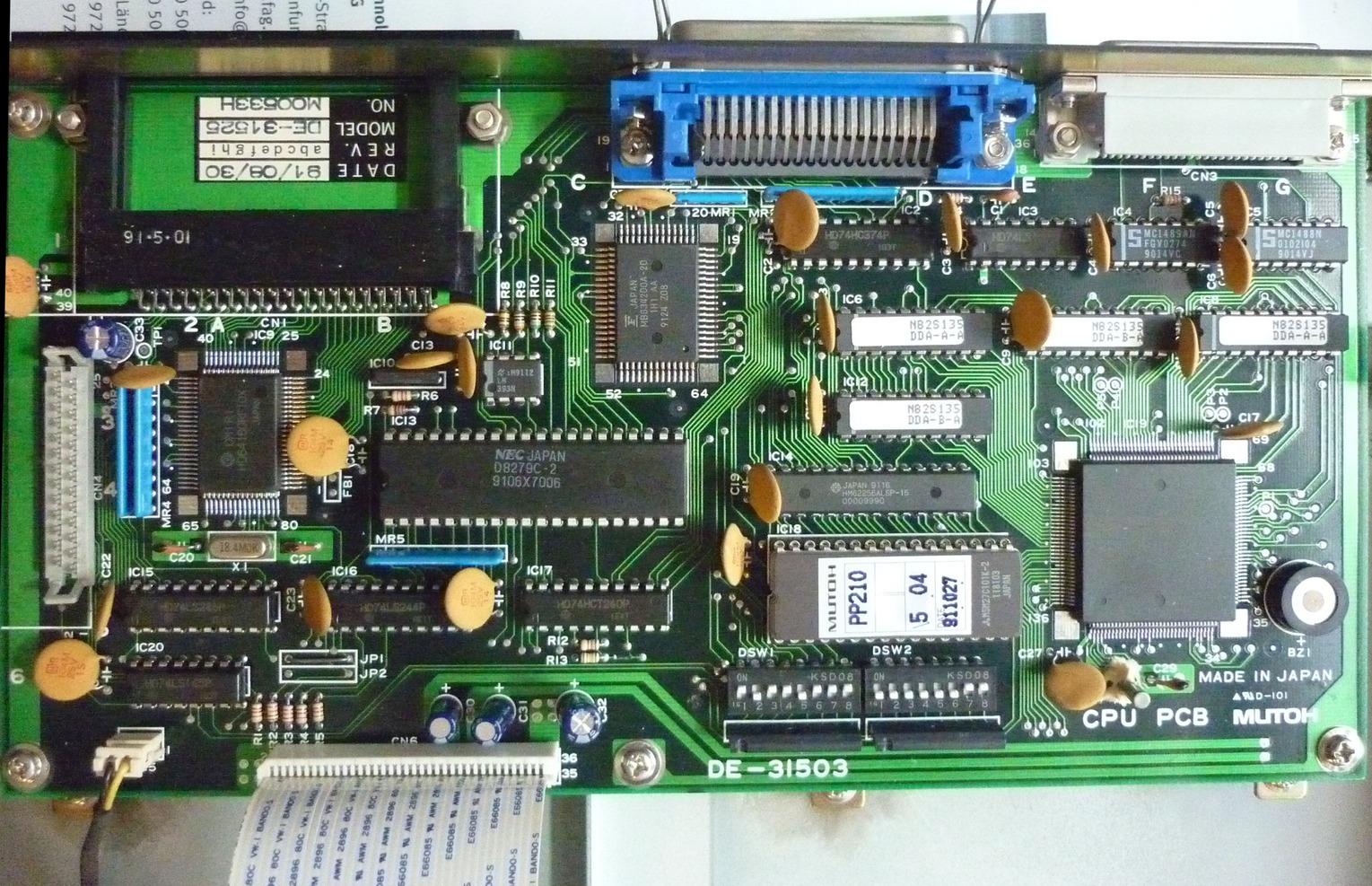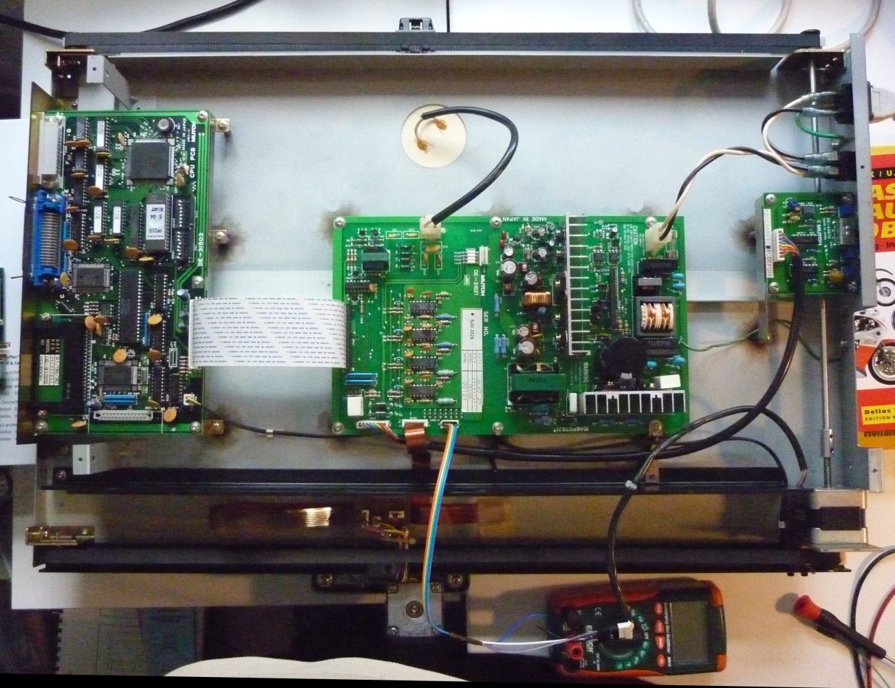 Hallo, ich habe demletzt einen alten (funktionierenden) Stiftplotter erhalten, den ich gerne in eine Übungsplattform für eine CNC-Gravierstation umbauen möchte. Die Elektronik ist in drei Platinen unterteilt (Bild ...548). Ein anderes Forenmitglied hatte wohl den gleichen Drucker mit ähnlichem Ziel zerlegt und Schwierigkeiten bei der Betriebsstromwahl, diese Frage konnte ich (weil Plotter noch intakt und Strommessung direkt möglich) schon für mich lösen, siehe Beitrag "Re: Schrittmotor Daten" und Beitrag "Re: Schrittmotor Daten" . Ich würde jetzt gerne darüber hinaus prüfen, ob ich die Platine mit Netzteil und Konstantstromregelung für die Motoren weiterverwenden und über einen Arduino mit Marlin ansteuern kann --> Schnittstellensuche. An der Stelle fangen nun meine Schwierigkeiten an, weil ich an einer Multilayer-PCB an die Grenzen meiner Reverse-Engineering Fähigkeiten stoße. Die Netzteilplatine (Bild ...543) hat vier ICs "T049 PBL 3717/2" die ich aufgrund des umgebenden Hühnerfutters auf zwei H-Brücken zuorndne. Zudem ist ein HD74SL38P montiert, das ist aber ein "Quadruple 2-input Positive NAND Buffers (with Open Collector Outputs)" und vermutlich nicht mit der Schrittansteuerung, sondern eher dem Aktivierung der Steuerströme bzw. der Stromregelung verknüpft ist. Also auf der Hauptplatine (Bild ...545) nach einer möglichen Schnittstelle für meine Arduino-Steuersignale gesucht. Hier finde ich potentielle Kandidaten für Schieberegister unter HD74LS ...145P BCD-to-Decimal Decoder / Driver (with 15 V outputs) ...240P Octal Buffers Line Drivers Line Receivers (inverted three-state outputs) ...244P Octal Buffers Line Drivers Line Receivers (non inverted three-state outputs) ...245P Octal Bus Transceivers (with three-state outputs) Der HD74LS145P hat eine schöne Logiktabelle im Datenblatt mit 10 verschiedenen mögliche Zuständen. Für eine Ansteuerung von zwei Schrittmotoren braucht man im Vollschritt 2x4 = 8 Zustände für die Ausgänge - mit vier digitalen Ausgängen auf die Inputs dieses IC gelegt könnte das also passen. Erscheint mir aber "fast zu einfach um wahr zu sein". Bevor ich jetzt aber Steuerleitungen an die IC-Pins löte und herumprobiere wollte ich euch fragen, ob schon einmal jemand eine Schrittmotoransteuerung mit diesem IC gesehen hat oder mir an dieser Stelle einen hilfreichen Tipp geben kann. --> Mich verwirren auch die drei weiteren benannten ICs die "nahe" am Flachbandkabel zur Netzteil / Stromregelungsplatine liegen, von der die Motoren gespeist werden. Bin für alle Inputs dankbar!