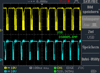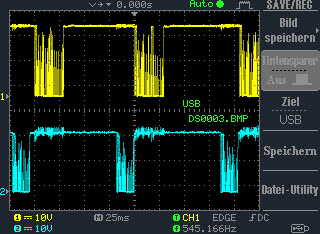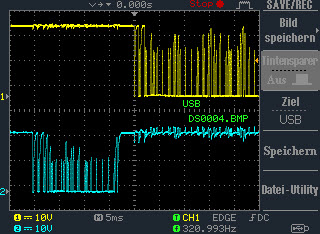 Bisher spricht aus meiner Sicht noch nichts gegen ein einfaches UART-Protokoll: Ruhepegel high, innerhalb der Datenpakete keine 10 Bitzeiten derselbe Pegel und für jede Richtung eine eigene Leitung. Dann hat sich jemand gedacht, daß logic-level-UART zu störempfindlich ist und man dem durch höhere Signalspannung abhelfen kann. Und anstatt fertige RS-232-Treiber zu nehmen hat er mit Transistor und Pullup etwas selber gebastelt. Wo auch immer die Spannung für die Pullups herkommt, eine besonders kräftige Quelle scheint das nicht zu sein, denn das Signal auf einem Kanal zieht den Ruhepegel des jeweils anderen deutlich runter. Gelb scheint den niederohmigeren Pullup zu haben, denn die Störung des blauen Ruhepegels durch das gelbe Signal ist stärker; auch scheint die Zeitkonstante der "Ladekurve" bei Gelb etwas geringer zu sein.