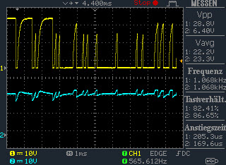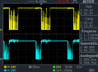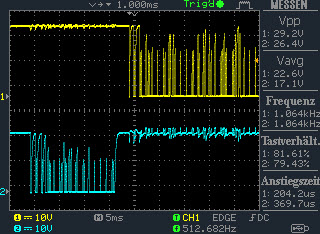 naja, wenigstens ist die Periodedauer der durch Flankenschändungen verunstalteten Pulse ablesbar. 100µs, 200µs oder 300 µs Das gibt schon mal eine Möglichkeit für Rückschlüsse auf die Taktrate ;)