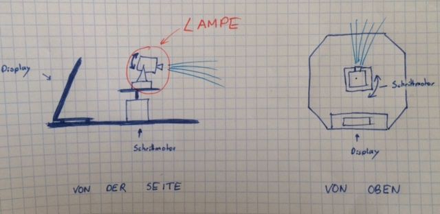 Hallo User ! Meine Gruppe baut einen Roboter, welcher ein HMI ist und eine Schnittstelle zu einem anderen Roboter darstellen soll. Unser Roboter steht an Ort und Stelle und dirigiert mittels Funk einen anderen Roboter (den der zweiten Gruppe), welcher beweglich ist. Er arbeitet eng mit unserem Roboter zusammen. Unser Roboter besitzt eine Tastatur, mit welcher wir Koordinaten eingeben können. Der Roboter der anderen Gruppe soll diese wiederum anfahren. Aus Gründen der Visualisierung wollen wir den fahrenden Roboter der anderen Gruppe beleuchten. Zu diesem Zweck wollen wir eine Lampe auf einem Schrittmotor befestigen. Die Lampe soll aber mittels Netzgerät und nicht mittels Batterien betrieben werden. Ebenfalls wäre es toll, wenn sich die Lampe nach oben und unten neigen ließe. Vielleicht auch mittels Steuerung. Die Bewegung nach links und recht bekommen wir mittels Schrittmotor hin. Da der bewegliche Roboter nicht so weit weg fährt genügt eine Ausleuchtung von 0-3 Metern. Der Lichtstahl soll kegelförmig und nicht gebündelt sein. Die Zeichnungen sollen helfen den Sachverhalt zu erklären. Ich hoffe jemand von euch kann uns weiterhelfen, eine passende Lampe zu finden. Womöglich LED. Lg Johannes