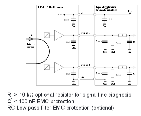 Hallo, ich beschäftige mich zur Zeit mit Stromsensoren und bin auf den DHAB S/15 von LEM gestoßen. Im Datenblatt ist eine typische Beschaltung hinterlegt, die ich im Anhang miteingefügt habe. Meine Frage ist nun, welche Funktionalität die Bauteile Cload und Rload an Kanal 1 und Kanal 2 haben? Ich danke im Voraus.