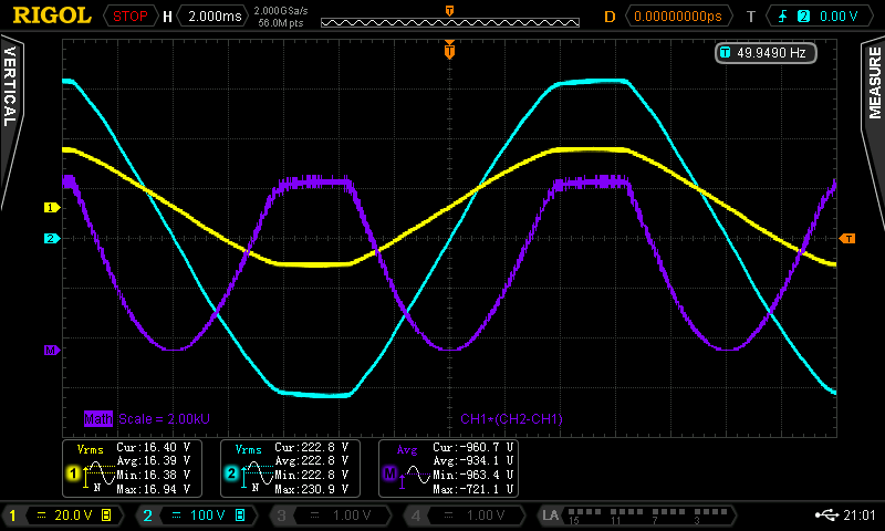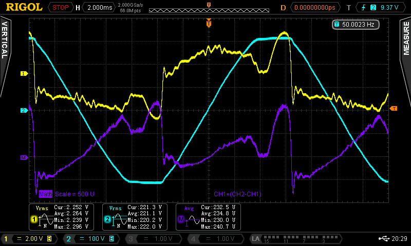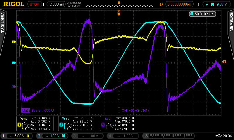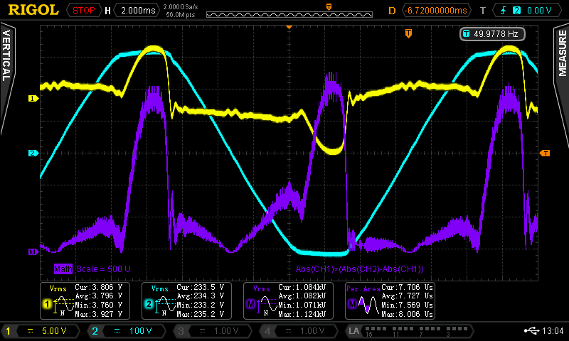 Ihr habt Recht, ich darf von der Leistung nicht den RMS-Wert, sondern den Mittelwert nehmen. Und durch die ordentliche Phasenverschiebung/verzerrung kommt es auch kurzfristig zu negativer Leistungsaufnahme, die ich nicht einfach per ABS hinzuzählen darf. Anbei nochmal neue Messungen mit korrigiertem Math-Channel. Idle 235 V² / 98,8 R = 2,4 W 2,5 W Last: 471 V² / 98,8 R = 4,8 W Gerade den Idle-Verbrauch finde ich aber weiterhin nicht akzeptabel, wenn ich das richtig sehe sind nach ErP nur noch < 0,5W erlaubt.