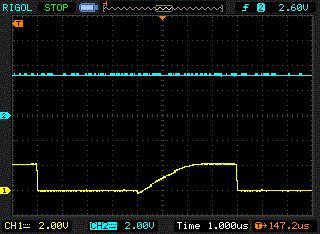 Ausgemessen: 580ns steigende Flanke 370ns fallende Flanke Nur die lahmen Signalflanken von Michael habe ich noch nicht gesehen. Bin mal gespannt wann er sich nochmal meldet und einen Schaltplan postet.