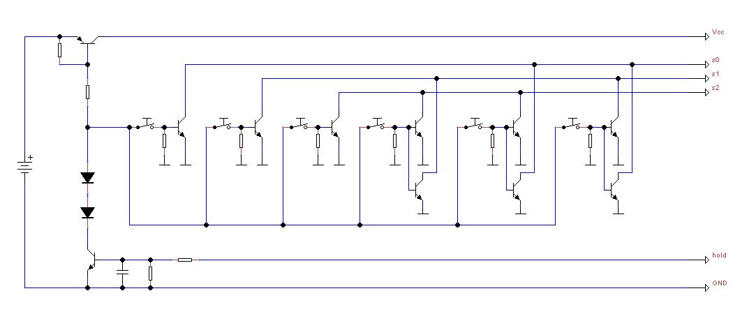 Markus Sierpinski schrieb: > Da in der Fernbedienung 6 Taster benötigt werden, habe ich mir Gedanken > gemacht, wie ich dies mit einem so kleinen Controller realisieren > könnte. Wenn die Verwendung des ADC nicht gerade Pflicht ist, dann wäre das mit ein paar Transistoren eigentlich einfacher möglich (siehe Skizze; die Autoabschaltung stammt von hier: http://clauff.pytalhost.com/?p=78 und wird lediglich um ein paar Taster erweitert). - durch einen Tastendruck kommt es zum Power-On - der Controller setzt die hold-Leitung... - liest s0-s2 aus um die gedrückte Taste zu bestimmen... - sendet das IR-Signal... - lässt hold wieder fallen... - und wartet im Tiefschlaf auf Power-Off (Taste losgelassen) Wäre weniger Frickelei und etwas batterieschonender. :)