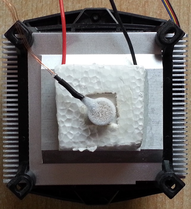 Tom P. schrieb: > Ich habe schon Peltierelemente gesehen, die vom Hersteller aus > kaskadiert waren. Bis zu drei Stück Pyramidenförmig übereinander. Ich > nehme an, dass der Wirkungsgrad dabei sowas von in den Keller geht. Ja der Wirkungsgrad ist schlecht. Aber bei solchen Elementen geht es ja meist nicht darum dauerhaft etwas zu kühlen, sondern bloß für ein paar Experimente. Ich hatte mir vor einiger Zeit mal so ein vierstufiges Peltierelement von Deal Extreme gekauft: http://www.dx.com/p/c1203-4p1540-4-level-semi-conductor-cooler-cooling-plate-189618#.VFzbVxbJAvl Von Conrad gibt es auch so eins - allerdings zum fünffachen Preis. Mit dem Element kommt man schon ziemlich weit runter. In Kombination mit einem billigen ARCTIC COOLING Alpine 11 PRO von Pollin komme ich locker in den Bereich von -50°C. Das tiefste, was ich je gemessen habe ist -64°C. Dort ist aber auch schnell Schluss, da der Widerstand des Peltierelements stark zunimmt. Soweit ich weiß nimmt man deshalb für tiefere Temperaturen auch andere Materialien. Anbei mal der einfache Aufbau im Betrieb. Gekühlt wird ein Messingblock mit 10mm Durchmesser und 7mm Höhe. Der Pt100 sagt, dass es gut -59°C sind. Man kann aber noch 2-3°C abziehen, da bloß eine Zweileitermessung durchgeführt wurde. Das Bild entstand etwa 3 Minuten nach dem Einschalten. Zu berücksichtigen ist auch, dass der Lüfter auf dem Tisch stand und deshalb keine optimale Luftzufuhr hatte.