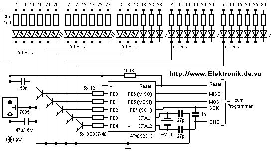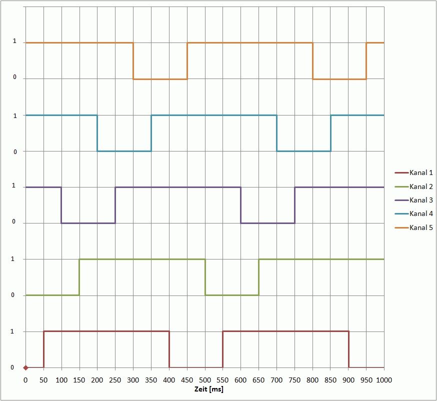 Hallo zusammen, ich bin neu hier und würde mich sehr freuen, wenn mir ein oder mehrere User mit Rat und Tat zur Seite stehen könnten! Eigentlich bin ich Bauingenieur mit gesundem (oder gefährlichem) Elektronik-Halbwissen und möchte mir für Schallmessungen ein sog. "Normhammerwerk" selber bauen (a um Geld zu sparen und b weils Spaß macht;-)). Hierzu müssen 5 genormte "Hämmer" mit bestimmten Gewicht und Zeitabstand auf den Boden klopfen. Das wird mit Hubmagneten realisiert und klappt im Test schon prima. Mein Problem ist die Steuerung: 5 getrennte Kanäle mit je 350 ms "ein" und 150 ms "aus", jeweils 100 ms zeitversetzt (siehe Abbildung). Nun habe ich im Netz die beiliegende Schaltung für ein LED-Lauflicht von Arne aufgestöbert und dachte mir, das könnte man entsprechend umstricken... Nun meine Fragen: 1. kann der Mikrocontroller so programmiert werden wie ich ihn brauche? 2. kann man statt der LEDs 5 Relais ansteuern (das Ganze soll auf auf 12 oder 24V laufen, die magnete ziehen immerhin ca. 2 A)? 3. müsste die Schaltung für 12V modifizert werden (LEDs wären ja raus) 4. ..und nun die bange Frage: Da ich mit Mikroprozessoren so gar keine Erfahrung habe.. wäre vieleicht jemand willens mir das Ding zu programmieren?? Natürtlich gegen entsprechende Gegenleistung. Freue mich auf eure Antworten!