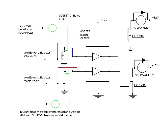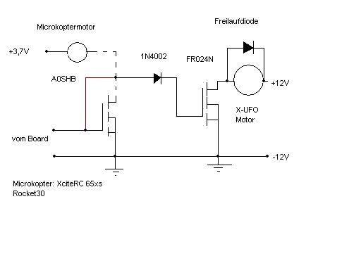 Ich bitte höflichst um Vergebung, sollte ich gegen irgendwelche Regeln Verstossen haben. Na gut, hier ein Plan nach dem ich vorgegangen bin. Die rote Verbindungslinie war der zweite Versuch, natürlich habe ich beim zweiten Versuch die Verbindung: Drain A0SHB zu N4002 getrennt, den Motor vom Microkopter habe ich schon vorher ausgebaut, (strichlierte Linie).