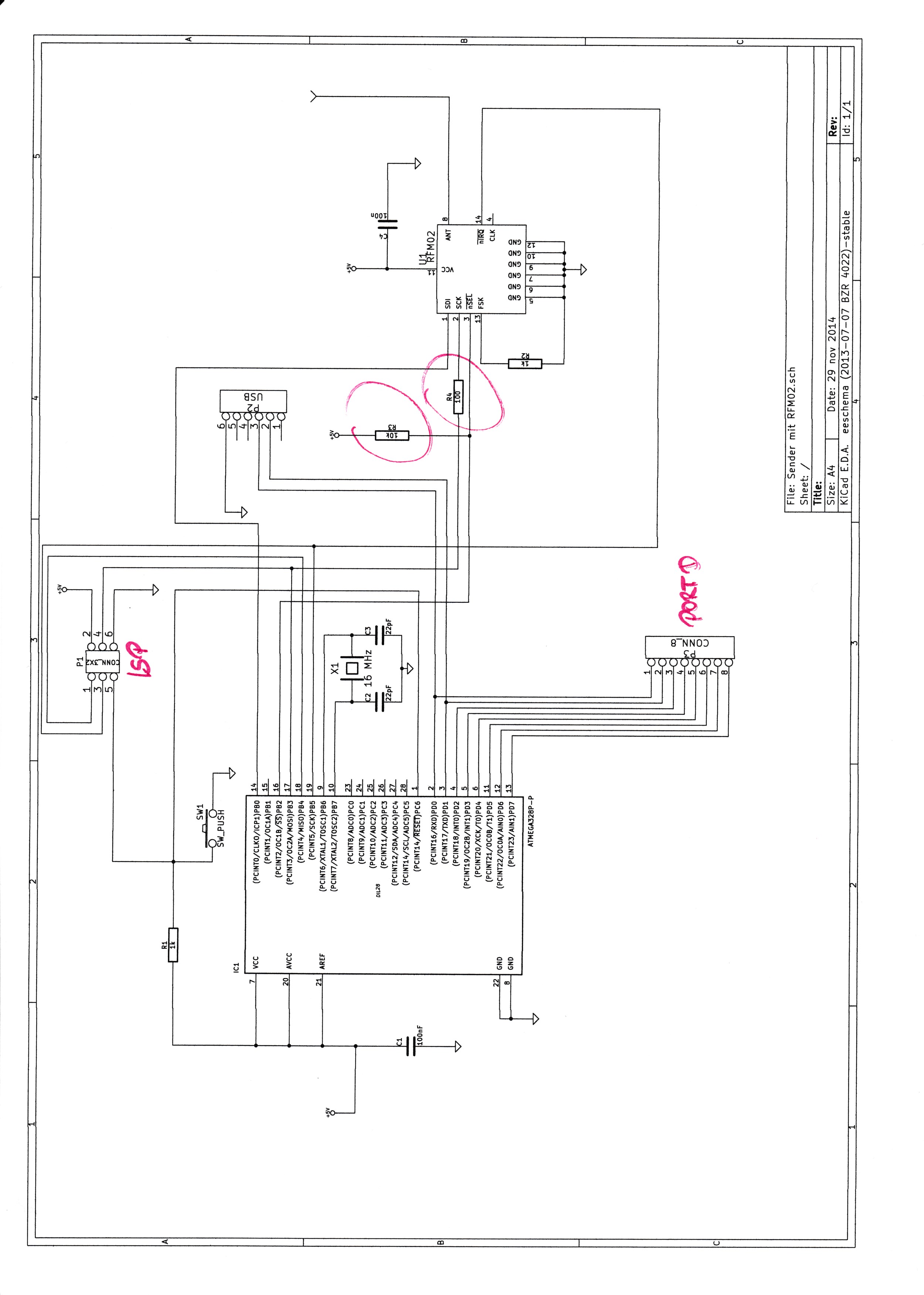 Guten Abend, ich habe die Hinweis aus dem Forum umgesetzt und in einen Schaltplan dargestellt. Meine Frage: Habe ich das so richtig gemacht? Oder muss ich alle Leitungen zum RFM 02 mit 100 ohmigen Widerständen belasten? Danke für Eure Antworten!