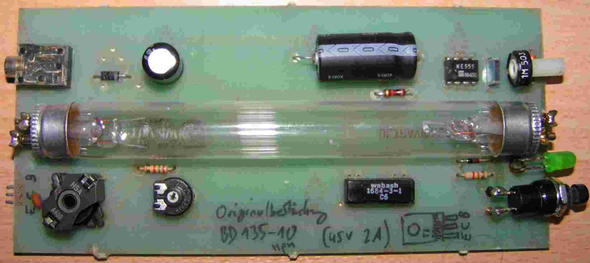 Meine gebraucht gekaufte Isel-Lampe scheint älter zu sein, da gibt es keine Zenerdiode. (Der Leistungstransistor war defekt, daher hatte ich einen anderen Typ eingelötet, der ist abgerissen.) Das andere, auch vom Flohmarkt, hatte ich davor jahrelang als Eprom-Löscher benutzt. Statt einer Drossel ist ein Kondensator vorgeschaltet, es riecht tatsächlich etwas nach Ozon wenn man es benutzt. Das dürfte so eine Niederdruck-Hg-Dampflampe sein. Anfangs benutzte ich auch mal eine UV-Prüflampe für britische Briefmarken - mein Vater hatte sowas. Unsere deutschen Briefmarken sollen eine andere Floureszenz-Linie haben, weniger gut für Eproms.