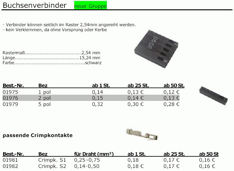 Hallo, suche für mein Stk500 Board weitere Pfostensteckverbinder (zweiadrig) in der Art, wie sie dem Board bereits beiliegen. Leider finde ich immer nur einseitig konfektionierte im Angebot. Wenn jemand eine Bezugsquelle für zweiseitig mit Buchsen konfektionierte Verbinder kennt, .... Gruß Werner
