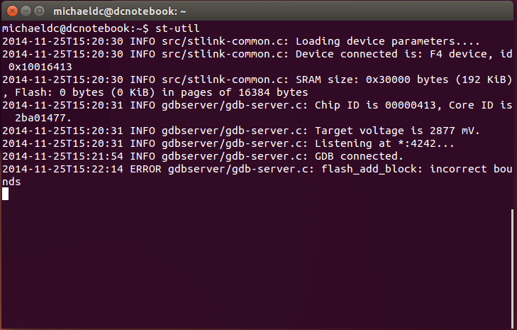 Hi, ich habe auch Ubuntu und den Texane mit STM32F4 Discovery. Ich MUSS es immer so machen: ST-Link starten, dann habe ich die Meldung wie 2014-11-25_st-flash_read.png Und dann Resetknopf drücken. Und dann erst weiter machen. Dann gehts. Ich versteh es nicht. Aber probier es mal.