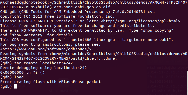 Hallo Zusammen, ich habe folgendes Problem. Ich möchte ein STM32F4 Discovery Board flashen und debuggen, was jedoch nicht funktioniert. Als Betriebssystem verwende ich Ubuntu (Linux). Auf dem Discovery Board ist ein STLink V2 verbaut. Hiefür habe ich die Texane STLink Software (https://github.com/texane/stlink) nach folgender Anleitung http://www.mikrocontroller.net/wikisoftware/index.php?title=STM32F4-Discovery&action=edit§ion=9 installiert. Zum Debuggen verwende ich den arm-none-eabi-gdb, Version 4.8-2014q3 (https://launchpad.net/gcc-arm-embedded/+download). Wenn ich nun STLink mit dem Befehl st-util starte, so wird die Verbindung zum Discovery Board anscheinend richtig aufgebaut (Bild 2014-11-25_stlink.png). Das Aufbauen der Verbindung zum GDB Server mit arm-none-eabi-gdb funktioniert auch. Möchte ich jedoch dann das Programm Flashen so erhalte ich die Fehlermeldung "Error erasing Flash with vFlashErase packet". (Bild 2014-11-25_arm-none-eabi-gdb.png). Um zu überprüfen woran das liegen kann habe ich dann nochmal zusätzlich versucht ob ich die Standardfirmware des Discovery Boards per "st-flash read test.bin 0x8000000 4096" auslesen kann. Hier wird jedoch auch nichts ausgelesen. (Bild 2014-11-25_st-flash_read.png) Kann mir jemand sagen was der Grund für diese Problem ist? Danke Schöne Grüße Michael