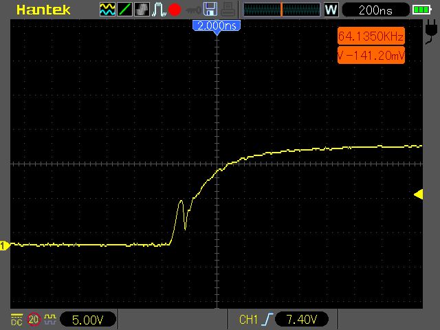 hallo Leute Ich bastel gerade an meinem ersten Schaltwandler.. Er dient als Grundlage für einen MPPT Regler.. Fällt mehr unter meine ersten Erfahrungen damit. Prinzipiell bin ich ganz zufrieden.. Performance ist mir momentan noch nicht so wichtig .. deswegen hab ich mal einen 25OHM Gatewiderstand drin Der Snubber wurde mit 17OHM und 47nF berechnet paralell über den LOW Fet gesetzt .. Bootstraap sind knappe 3x330µF Folie .. Ich weiß Kerko wäre besser hab ich leider grad nicht da Frequenz 64KHZ Treiber IR2184 Fet IRF3710 Funktioniert eigentlich ganz gut..ABER jetzt hab ich aber folgendes verhalten im Highanstieg.. Schaut wie ein Einbruch aus?.. Womit ist der eventuell zu begründen? Anbei 2 Bilder einmal vom FET Highanstieg G->S gemessen und einmal Ausgangsspannung VCC GND Hat jemand eventuell einen Tip für mich?