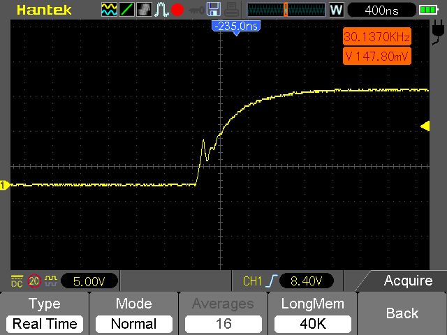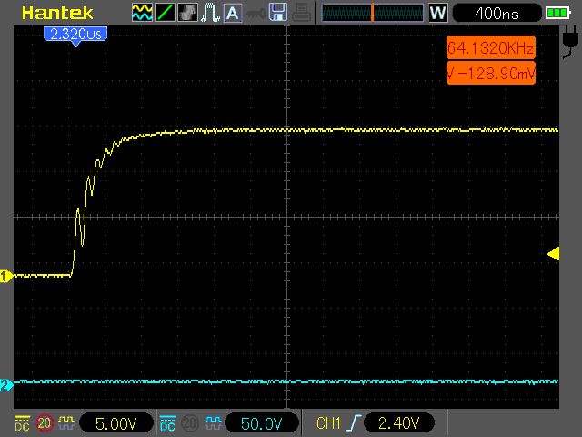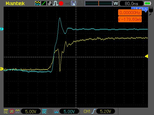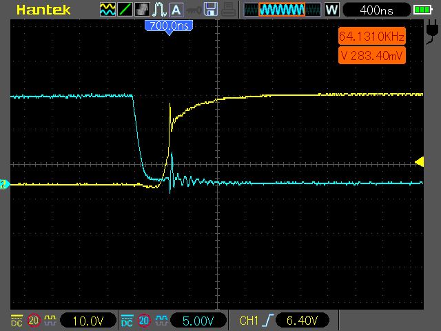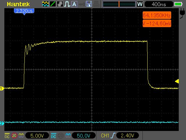 Nö die Stufe ansich würde mich nicht stören meine Frage bezog sich nur auf den Spannungseinbruch in der G/S spannung. weil genau mit syncron hab ich auf der Ausgangsspanung Rippelpeaks genau in der selben Form also nicht das Plateau stört mich das ist mir schon klar ..sondern das einbrechen .. so wie ganz oben.. das erhöht sich ja mit steigern der last .. Ich hab jetzt schon soviel herumgelötet und umgebaut auf der Platine das die wege jetzt wirklich sehr kurz sind.. Ich bin davon ausgegangen das ich da ein Problem hab .. ist das dann also in der Form G/S am HI Fet ganz normal das die Spannung dann hier am Plateau einbricht? Wenn ich mitr Drain/Source ansehen schaut das komplett normal aus..