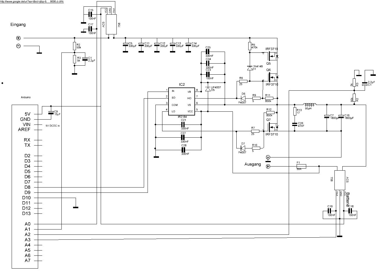 Anbei der Schaltplan. Ich hoffe ich hab ihn jetzt richtig abgeändert .. dürfte stimmen .. Kurzer Überblick über die Platine.. ist aber nicht beschriftet ist nur einlagig deswegen das Design.. das wird sich noch ändern.. .. einphasig in der Mitte am Engpass ist 2,5mm Aufgelötet also Controller hab ich einen Arduino Nano drauf gesetzt davon hab ich grad massig da . Speicherdrossel ist ein EDT59 Kern mit 4mm Spalt