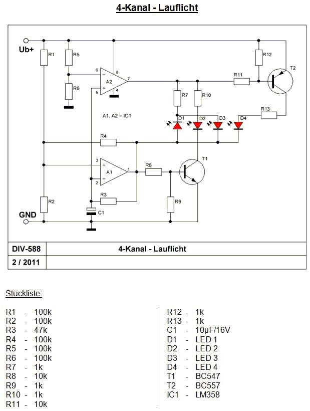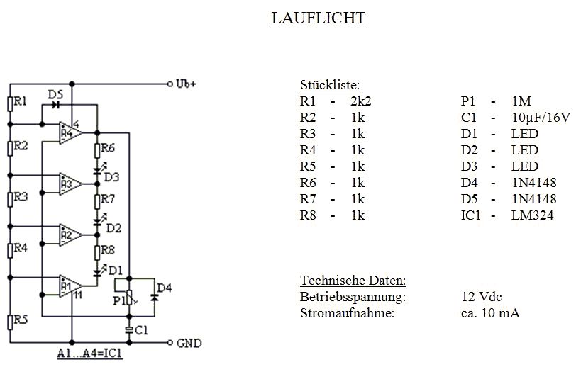 Habe zwei Vorschläge für dich. 1. Lauflicht für 3 LEDs (LM324) 2. Lauflicht für 4 LEDs (LM358) Beide für 12V Betriebsspannung. lg