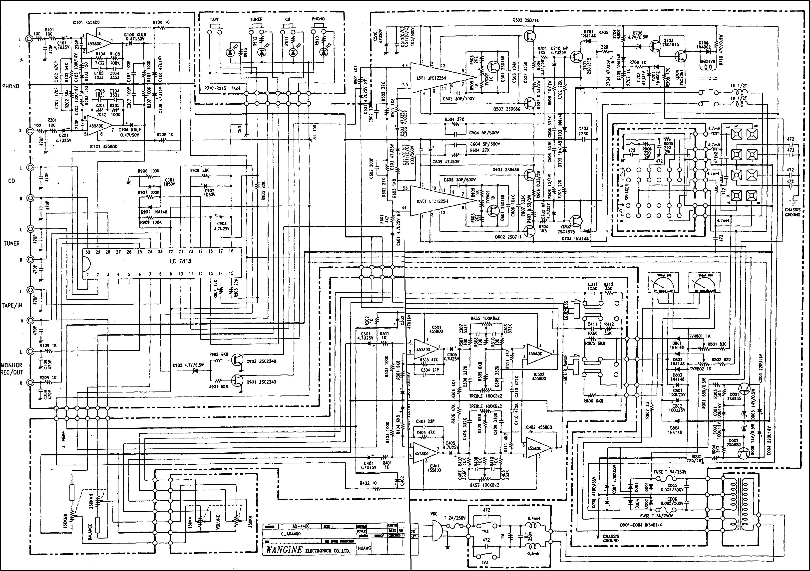 > MP3 Player über Cinch Stereo zu Miniklinke 3,5 mm Stereo > Kabel - angeschlossen: es brummt weiterhin. Und ale anderen Verbindungen zur Hifi Anlage, Computer, Fernseher, etx waren dabei ab? Wenn ja, dann ist es keine Masseschleife. Schäde, wäre leicht zu lösen gewesen. Aus dem Schaltplan geht hervor, dass die Ausgänge mit integrierten Endstufen realisiert wurden, die eine Gegenkoppelung haben. Bei diesen Chips sollte man davon ausgehen dürfen, dass sie Brummen auf der Spannungsversorgung ausreichend unterdrücken. Abgesehehn davon sollte die Versorgungsspannung ohne großartige Last nicht wirklich brummen. Das würde ich auf jeden Fall mit einem Oszilloskop nachmessen. Blöd, dass du keins hast. Vielleicht strahlt der Transformator kräßtige Magnetfelder ab, die von den Bauteilen um die Endstufe herum oder den Leitungen zum Lautstärke-Poti empfangen werden. Ist es ein Rinkern Trafo? Zur Probe könntest du mal den Transistor Q901 oder Q902 kurz schließen (Kollektor-Emitter). Wenn es dann immer noch brummt, liegt der Fehler in der Endstufe. Wenn es dann nicht mehr brummt, liegt der Fehler davor, eventuell in der Klangregelung. Wie dem auch sei - ohne Oszilloskop wirst du warscheinlich nicht viel weiter kommen. @Edit: Ich sehe gerade dass der Schaltplan n9chtmal mit dem Gerät überein stimmt. Dann vergiss es. Kauf einen anderen Verstärker oder lebe damit.