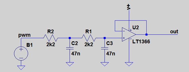 Die PWM bewegt sich zwischen 0...3,3V, ich messe am OPV-Eingang 0,33V und am Ausgang, egal wie ich den Eingang wähle 0.7V.