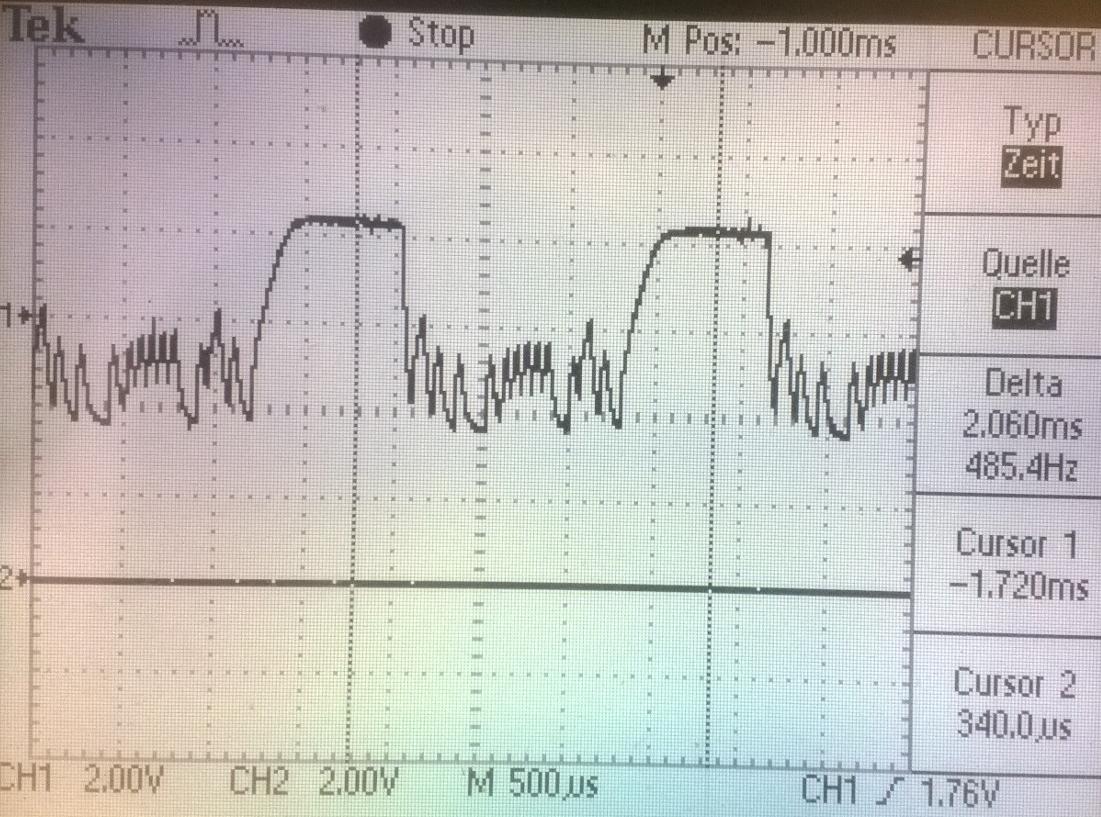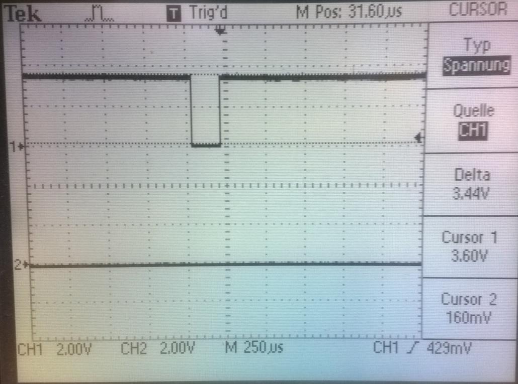 Hallo zusammen! Ich freue mich, dass sich nun schon zwei nette Menschen meines Problems angenommen haben :-) > Keine Ahnung, wie sieht denn gleichzeitig die RX-Leitung aus? Da sollten > ja vorher Daten rinkommen. > Bei 33kbps ist die Bit-Zeit für ein ACK 30us. Das vermeindliche ACK ist > eher 200us lang. Passt irgendwie nicht zusammen. Die LOW-Phase in der TX-Leitung dauert genau 180us. Das passende Bild des Oszilloskops habe ich euch auch angehangen. Außerdem wie gewünscht ein Bild zu beiden Leitungen gleichzeitig. Gemessen wurden diese Daten direkt am CAN-Controller. Aufgefallen ist mir dabei, dass die rot markierten Stellen stark am flackern waren. Die anderen Teile waren jedoch konstant sichtbar. Zur Pinbezeichnung (aus dem Datenblatt): TXCAN - Pin 1 - Output - Transmit output pin to CAN bus RXCAN - Pin 2 - Input - Receive input pin from CAN bus Über CANoe sende ich übrigens alle 50ms eine CAN-Botschaft mit der ID 0x322, DLC=8, Nutzdaten alle 0x00... falls das weiterhilft... > TX/RX vertauscht? > CAN_H und CAN_L vertauscht? > Kalte Lötstelle? Leitungen habe ich bereits mehrfach durchgepiepst. CAN_H und CAN_L kann ich nicht vertauschen, da ich den MC33897, also einen Single-Wire-CAN-Transceiver einsetze. Kalte Lötstellen schließe ich auch aus, das sieht alles recht ordentlich aus und kontaktiert soweit sehr gut. Die Schaltung befindet sich übrigens im Moment noch auf Lochraster... > Wurde das gemessene Signal mit dem Peak gesendet oder ist des das > zurückkommende TX Signal? Ich glaube nicht, dass ich deine Frage 100%ig richtig verstanden habe. Aber ich denke das Bild des Oszilloskopes sollte dir deine Frage beantworten. Wie das Bild gemessen wurde habe ich oben ja bereits ausgeführt. Nochmals vielen Dank für eure investierte Zeit :-) EDIT: Die Periodendauer, gemessen an der Zeit zwischen zwei fallenden Flanken auf der TXCAN-Leitung, beträgt übrigens 4,14ms. EDIT2: Vielleicht ebenfalls interessant eine Aufnahme von ca 250ms auf beiden Leitungen... Die Botschaft sollte, so ist es im Programm eingestellt, alle 50ms gesendet werden...