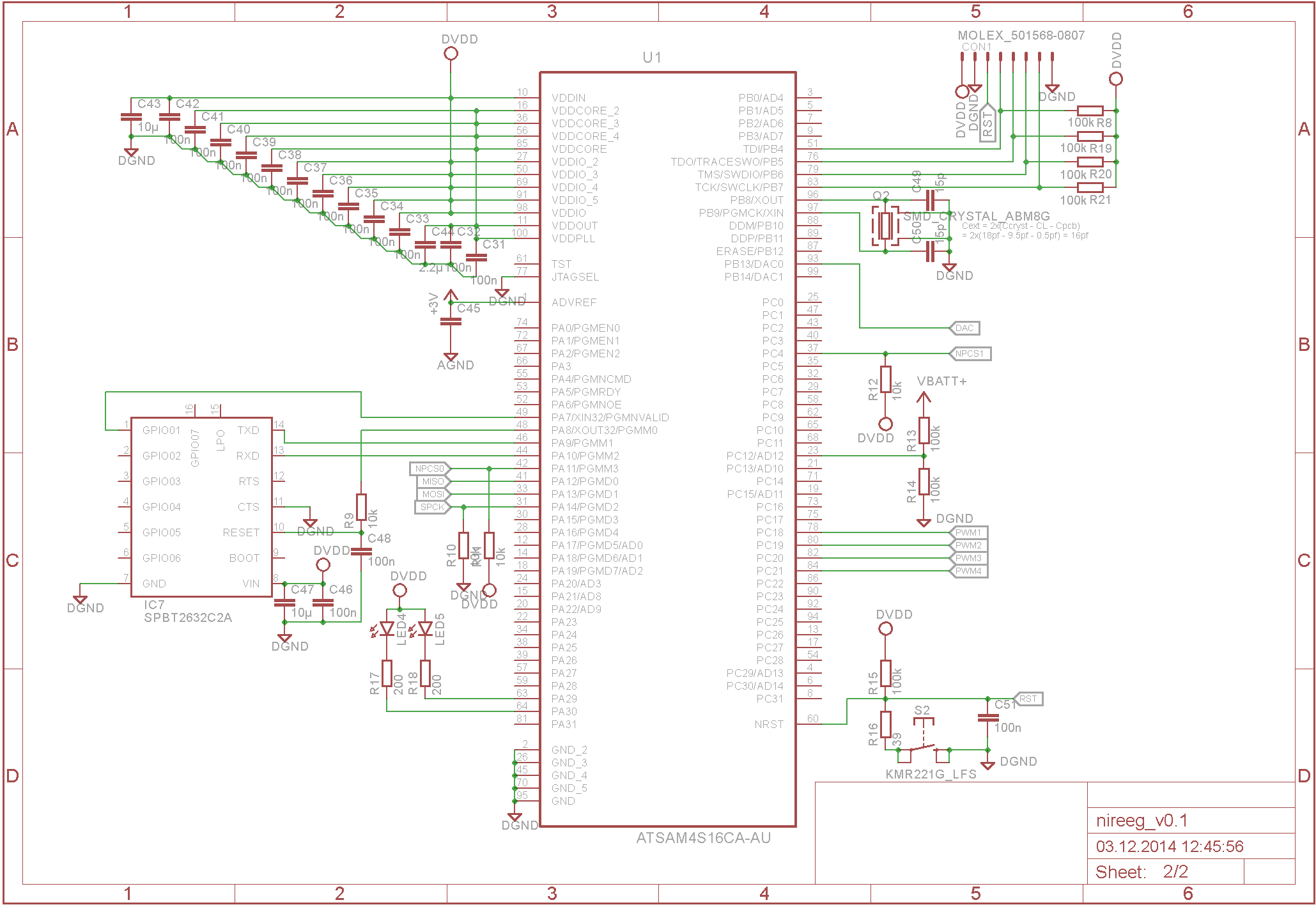 Danke für deine Anmerkungen Easylife! Das mit den 100k pullups hatte ich mir aus p14 vom SAM4S-EK Development Board User Guide abgeschaut (www.atmel.com/Images/doc11139.pdf), ATASM4S Datenblatt sagt auch "Typical pull-up and pull-down value is 100 kΩ for all I/Os." - Deshalb lasse ich die mal besser so. VDDIO2 ist korrigiert Die RTS CTS Anmerkung war wichtig, hatte ich völlig vergessen! Am ehesten muss CTS vom BT Modul ja pulldown oder? Den Reset Pullup mache ich auch wieder lieber mit 100k - vorallem, weil ja Batteriebetrieb und damit Faktor 10 weniger Stromverschwendung an der Stelle. Zum JTAGSEL: Ich verstehe nicht so ganz, was der macht (bisher auch nur über AVR ISP mkII ohne JTAG programmiert). Das Datenblatt sagt ja "SW-DP or JTAG-DP mode is selected when JTAGSEL is low." und "The JTAG pin and PA7 pin are used to select the JTAG Boundary Scan when asserted JTAGSEL at a high level and PA7 at low level." Sofern ich das richtig verstanden habe, brauche Ich den JTAG-DP mode zum Programmieren/Debuggen - also JTAGSEL auf GND. Was ist denn der JTAG Boundary Scan, den ich bei nem Jumper zu VCC ermögliche? Im Anhang die aktuelle Schaltung, auch um ein paar LEDs erweitert. Kann mir zufällig jemand die Fragen zum PLL - oder 32Bit SPI - oder UART Ringbuffer beantworten? Beste Grüße
