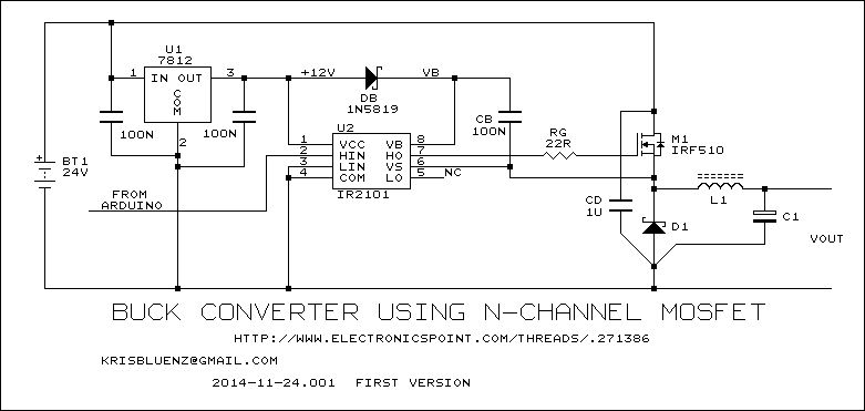 Steffen Warzecha schrieb: > Die Bootstrap Schalung holt sich ja die Spannung über D1 also ist > die > max. 15V (bezogen auf Vs). Der 100k Widerstand R0 muß allerdings weg. > Der Widerstand am Gate sollte auch viel kleiner sein, der versaut Dir > bei höheren Schaltfrequenzen die Flankensteilheit. > Das Problem ist aber das ja Vs wegen D2 niemals Massepotentioal hat und > so C113 (47µ sind viel zu hoch 2,2µ reichen) nicht aufgeladen wird, > somit funktionieert der Bootstrap nicht. Der IC ist ja ein > Brückentreiber und erwartet ein FET in der Lowside der ja wenn Highside > off ist Low durchsteuert und so Vs an Masse legt. > Wenn Du also unbedingt so steuern willst brauchst Du einen Highside > Treiber der seine Gatesteuerspannung anders erzeugt. Wie kann noch eine Gatesteuerspannung für ein High Side schalter erzeugen? Ich habe ein Schaltplan für ein Tiefsetzsteller gefunden, der acu mit IR2101 angesteuert wird. (im Anhang) Würde meine Schaltung funktionieren, wenn ich den Mosfet Treiber mit 12V Versorge und anderen Teil mit z.B. 24V ? (wie im Anhang)