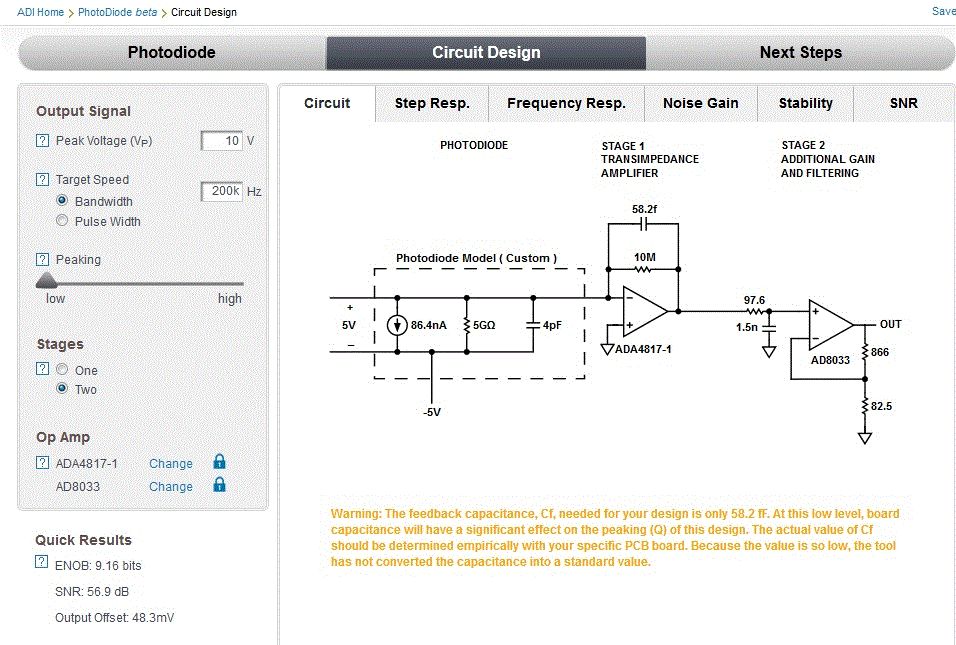 Hallo Zusammen, auch wenn das Thema schon etliche male diskutiert wurde, hänge ich gerade an der Berechnung eines Transimpedanzverstärkers für eine optimale SNR. In der Rückkopplung sollen 10Meg hängen und die Bandbreite bei 200kHz liegen. AD hat ein prima Web-Tool, um PD Vorstufen zu berechnen: http://www.analog.com/designtools/en/photodiode/#/circuitDesign Ich zweifel jetzt an meinen Berechnungen, weil das Tool in Sachen rauschen vollkommen andere Ergebnisse liefert. Beispiel: Als PD sind als Parameter 4pF Kapazität und 5GOhm Widerstand angegeben. Um bei 86nA Photostrom auf 10V Ausgangsspannung zu kommen, wird mir ein zweistufiges Design mit einem ADA4817-1 vorgeschlagen. Copy Paste von der Berechnung des Rauschens laut Tool (ich hoffe die Formatierung geht nicht flöten): Stage 1 Stage 2 Op Amp Voltage 4.2m Op Amp Voltage 280u Op Amp Current 170u Op Amp Current 1.6n RF 2.8m RF 8.5u RIN 1.7u RG 27u RFILTER 17u Stage 1 Total 5m Stage 2 Total 290u Abgesehen davon, dass das Rauschen viel zu hoch ist, komme ich beim Rechnen von Hand auf total andere Ergebnisse. Allein das thermische Rauschen vom 10Meg Widerstand: ich hab mit sqrt(4kTBR) 174µV ausgerechnet, nicht 2,8mV. Auch Strom- und Spannungsrauschen: ich habe für den Eingang berechnet: Uu=sqrt(200kHz)*4nV/sqrt(Hz)= 1,8uV Ui=10MOhm * 2.5fA/sqrt(Hz)*sqrt(200kHz)=11µV Ist es wirklich so, dass das Rauschen des Widerstands im Verhältnis zum Rauschen des OPVs so groß ist? Im Vergleich zu der Berechnung mit dem Web-Tool - habe ich überhaupt richtig gerechnet? Wie komme ich mit den Werten des Eingangsrauschen auf das effektive Ausgangsrauschen? Ich würde mich über Hilfe von euch freuen. Viele Grüße Achim