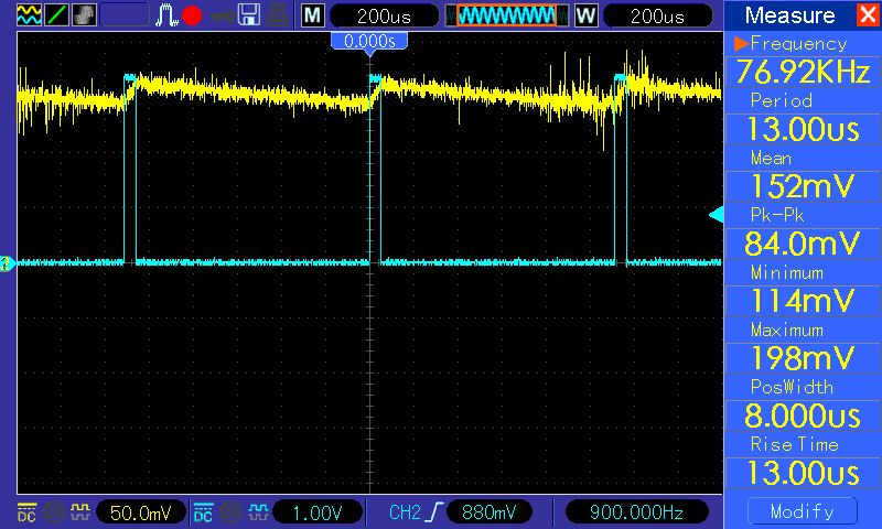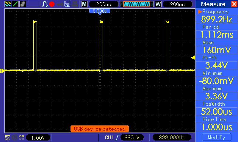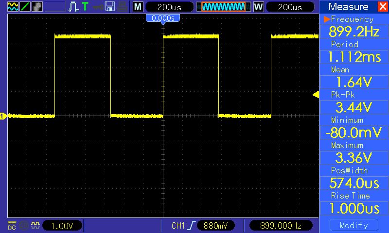 Nun habe ich das kleine Modul mal verkabelt, mit 3,3V versorgt, an der Hue Brigde angemeldet und an das Oszi gehängt. Erste Überraschung: Es funktioniert auf Anhieb an der Hue Bridge. Zweite Überraschung: Bei 0% Helligkeit ist die PWM noch etwas da (siehe erstes Bild). Das zweite Bild zeigt die PWM bei etwa 50% Helligkeit. Das dritte Bild zeigt die geglättete (naja) PWM bei 0% Helligkeit nach einem 100k/100n Tiefpass. Fazit: Deutlich billiger kommt man zur Zeit wohl nicht an eine Möglichkeit, seine "dummen" LEDs/Lampen mit etwas Eigenarbeit an eine Hue Bridge zu dengeln. Hossa!