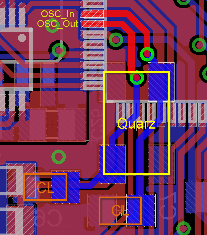 Guten Abend zusammen, ich habe heute meine neuen Platinen bestückt und wollte diese testen. Allerdings scheint der Quarz nicht anzuschwingen. Zumindest läuft das Programm des STM32 nicht ab. Berühre ich nun einen Pin des Quarze mit dem Tastkopf oder mit dem Finger läuft der Mikrokontroller los (läuft auch nach dem Loslassen weiter). Woran könnte dies liegen? Mein Layout ist bestimmt nicht optimal, aber es sollte doch trotzdem funktionieren, oder was meint ihr? Ich habe folgenden Quarz: http://de.rs-online.com/web/p/quarzmodule/8136031/?searchTerm=813-6031&relevancy-data=636F3D3126696E3D4931384E525353746F636B4E756D6265724D504E266C753D656E266D6D3D6D61746368616C6C26706D3D5E5C647B337D5B5C732D2F255C2E2C5D5C647B332C347D2426706F3D313426736E3D592673743D52535F53544F434B5F4E554D4245522677633D4E4F4E45267573743D3831332D3630333126 Als Lastkondensatoren verwende ich 15pF der Quarz ist für 12pf angegeben. Hat das so einen großen Einfluss? Vielen Dank im Voraus und Grüße Michael